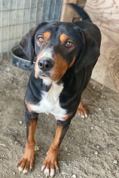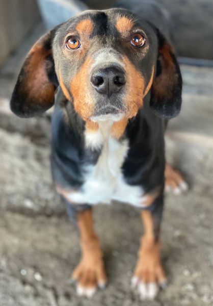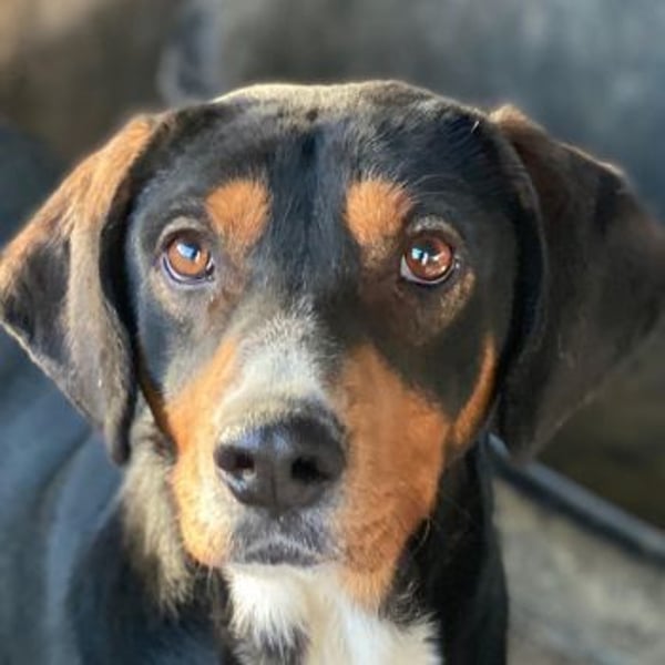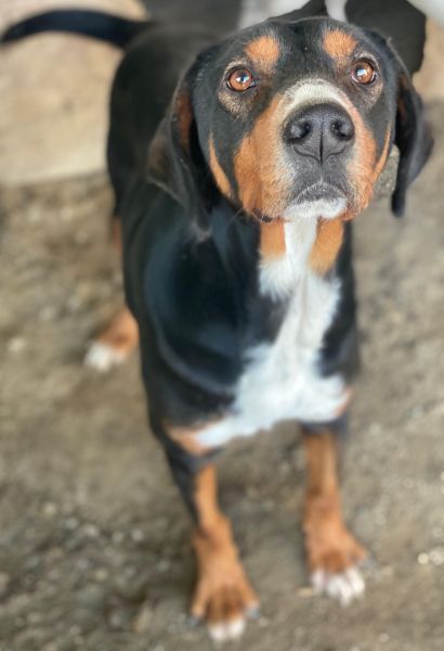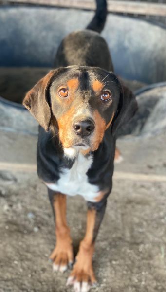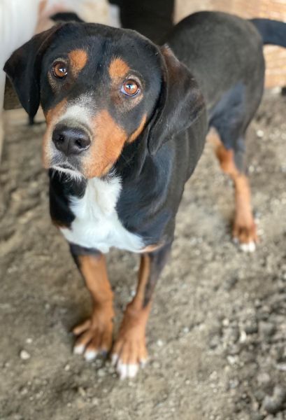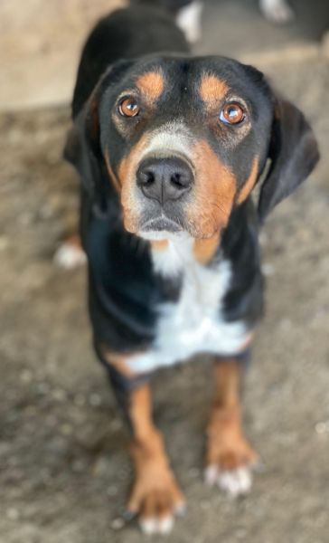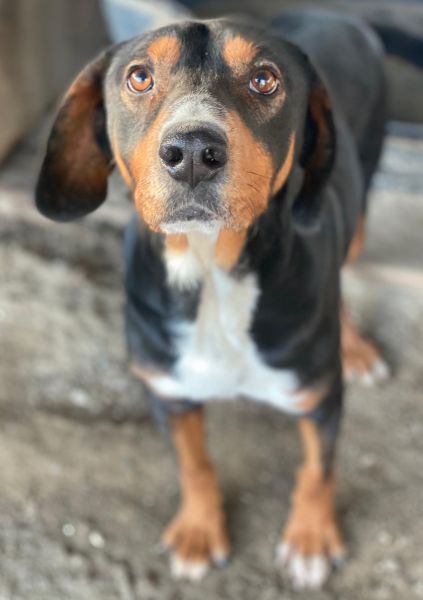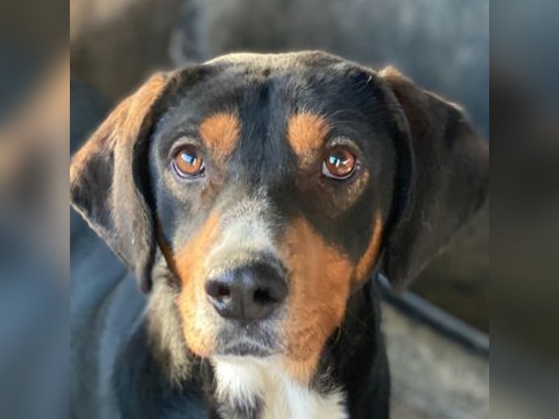 Dürfen wir also vorstellen: Das ist Kabelo – ein bildhübscher Rüde im besten Alter! Sein dreifarbiges Fell ist überwiegend schwarz, akzentuiert durch warme braune Abzeichen im Gesicht und an den Läufen sowie eine weiße Brustpartie. Seine treuen, aufmerksamen Augen und die sanften Schlappohren verleihen ihm einen charmanten Ausdruck.