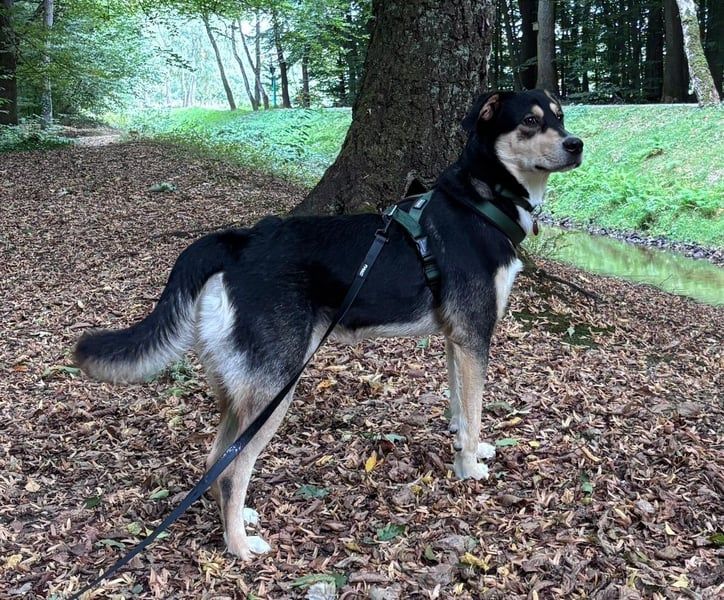 Draußen hat der hübsche Rüde keine Probleme mit Autos und lauten Geräuschen, nur E-Scooter und Fahrräder verunsichern ihn. Bei Dunkelheit zeigt er sich skeptisch.