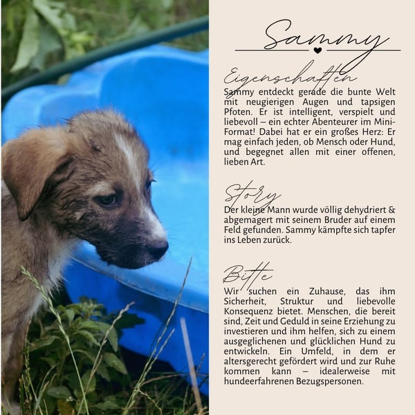 Wir freuen uns, wenn SAMMY bald eine liebevolle Familie findet, die ihm die Wärme und Geborgenheit schenkt, die er verdient.