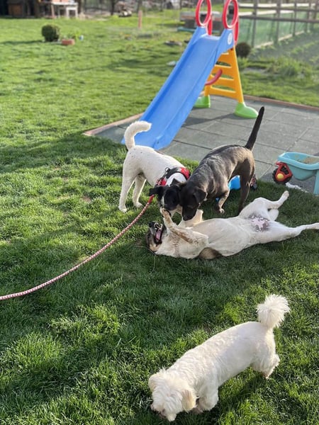 Mit anderen Hunden versteht sich Olive gut. Sie ist sozial, verspielt, aber auch rücksichtsvoll – besonders gegenüber älteren oder zurückhaltenderen Hunden. Toben im Garten gehört genauso zu ihrem Alltag wie gemeinsames Dösen mit ihren Schwestern. Olive teilt gern ihre Spielsachen, spielt aber auch mal allein oder zieht sich bewusst zurück, wenn ihr danach ist. Katzen gegenüber zeigt sie sich neugierig, aber vorsichtig. Ein direkter Kontakt hat bisher nicht stattgefunden, kann jedoch gerne getestet werden.