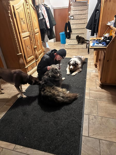 Dabei profitiert der junge Herr Hund sowohl von der vorgelebten Erfahrung seiner vierbeinigen Kollegen, als auch von den unaufgeregt souveränen Umgangsformen seiner zweibeinigen ‚Pflegeeltern‘,- von wiederkehrenden, ritualisierten Abläufen und dem, Schutz und Sicherheit bietenden häuslichen Rahmen, der an die Stelle unbarmherziger Einsamkeit zwischen Beton und Gitterstäben getreten ist.
