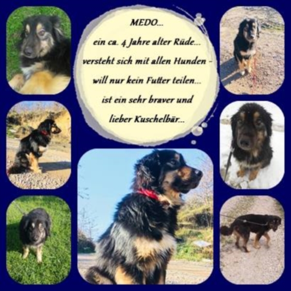 Hallo! Ich habe den schönen Namen Medo bekommen, denn das bedeutet Bär...und wie ihr sehen könnt, schaue ich ja wie ein knuffiger Bär aus. Ich bin auch ca. 60 cm groß. Aja - und so ca. 4 Jahre alt.... Ich verstehe mich eigentlich mit allen Hunden - nur manchmal will ich nicht unbedingt mein Futter teilen... Ich gehe brav an der Leine und Kinder und Menschen sind auch kein Problem für mich. Meine Pflegemamis und Pflegepapis vermuten, dass ich schon einmal ein eigenes zu Hause hatte, denn wenn sie mir sagen, ich soll mich hinsetzen, dann mache ich das gleich - genauso mit Pfote geben.... Willst Du mir wieder ein eigenes Zuhause geben, wo ich dann für immer bleiben darf?? Dann melde Dich doch bei meinen Pflegemamis oder unter: nirina.adoption@gmail.com