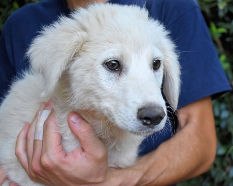 Die zwei Welpen wurden ausgesetzt und mitten auf der Straße gefunden, voll mit Flöhen und Dermatitis und vor allem schrecklich unterernährt. Sie sehen aus wie Maremmano Mischlinge, sind dafür aber eigentlich viel zu klein für ihr Alter. Doch vielleicht wurde durch die Unterernährung ihr Wachstum unterbrochen, darum wollen wir die Möglichkeit nicht außer Acht lassen, dass ein wenig Maremmanenblut durch ihre Adern fließen könnte. Das heißt, dass unser Franky durchaus mit einigen der faszinierenden Eigenschaften eines Maremmanen ausgestattet sein könnte. Und so möchten wir Ihnen, liebe Leserinnen und Leser, an dieser Stelle unsere Ausführungen zu diesen zauberhaften und beeindruckenden Tieren ans Herz legen. Bitte schauen Sie hier: