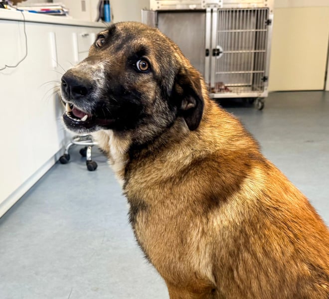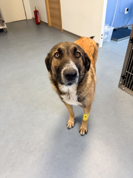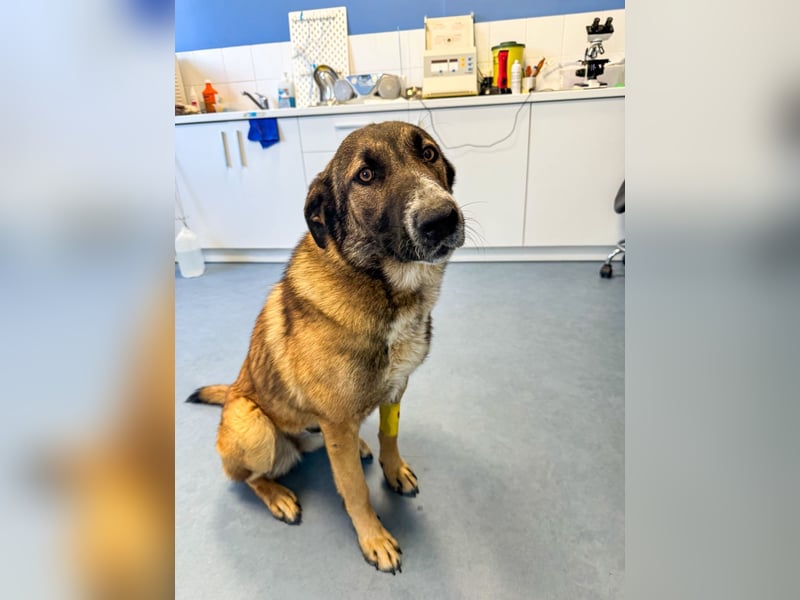 Auf den ersten Blick fällt ihr weicher, treuer Blick auf, der direkt ins Herz geht. Optisch erinnert sie ein wenig an einen Schäferhund-Mix mit einem warmen, weichen Fell und einem besonders liebevollen Ausdruck.