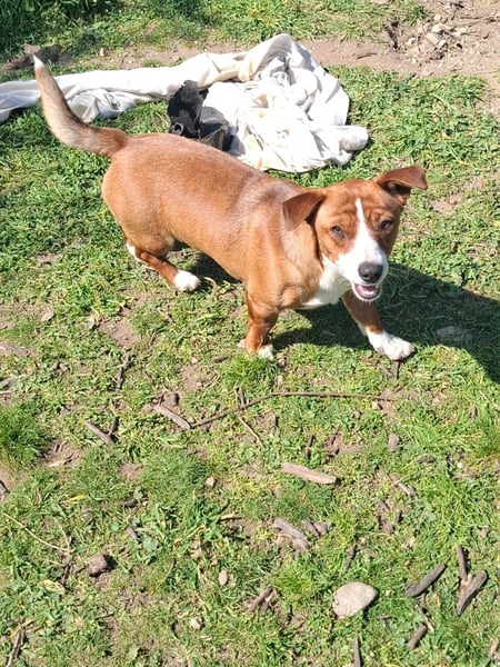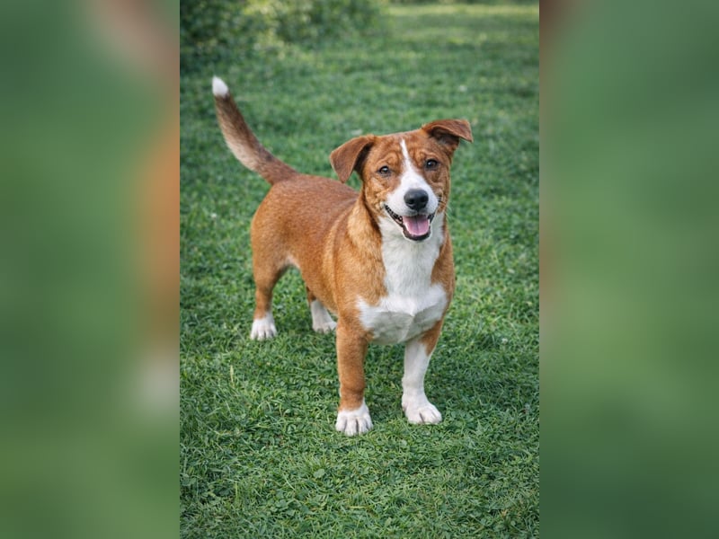 Canelo ist ein kleiner, fröhlicher und absolut liebenswerter Rüde. Schon auf den ersten Blick fällt sein freundlicher Ausdruck und sein offenes, strahlendes Wesen auf. Mit seinem braun-weißen Fell, den wachen Augen und den leicht kürzeren Beinen erinnert er optisch ein wenig an einen Mix aus Terrier und Dackel oder vielleicht auch einem kleinen Laufhund – auf jeden Fall ein ganz besonderer, charmanter Mischling.