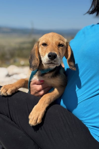 Arlo ist ein Jagdhundmix und wird vermutlich mittelgroß. Er freut sich über den Besuch einer passenden Hunde(halter)schule, in dem ihr gemeinsam das Hunde-Einmaleins lernen (oder auffrischen) und euch noch besser kennenlernen könnt.