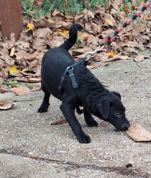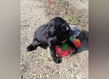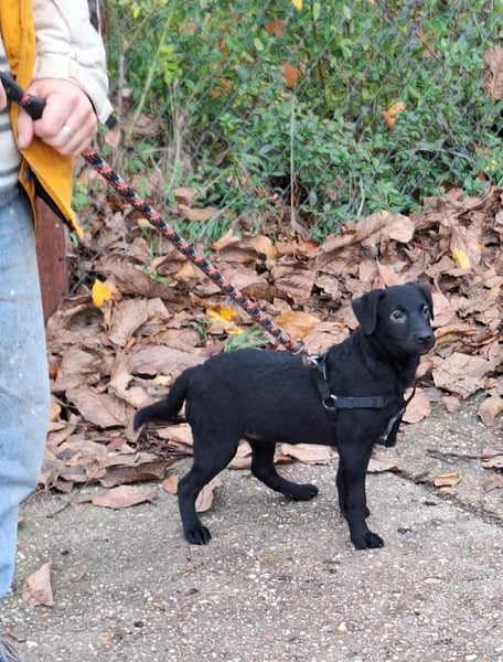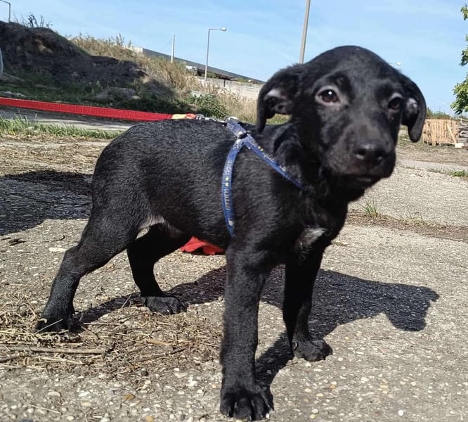 Ihr glänzendes schwarzes Fell wird von einem kleinen weißen Fleck auf der Brust geziert – ein besonderes Merkmal, das Mira unverwechselbar macht und ihr einen ganz eigenen Charme verleiht.