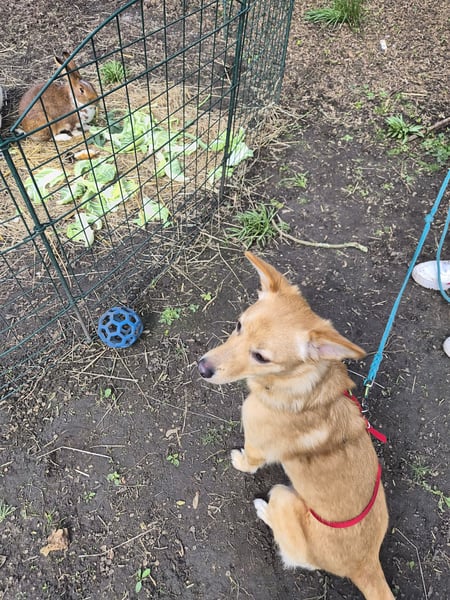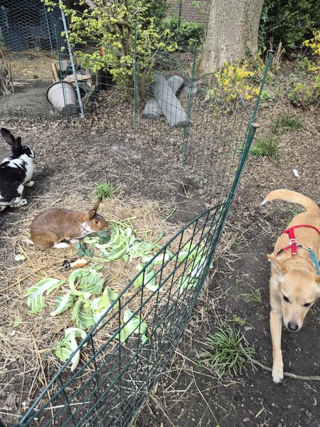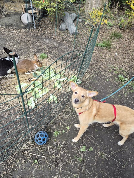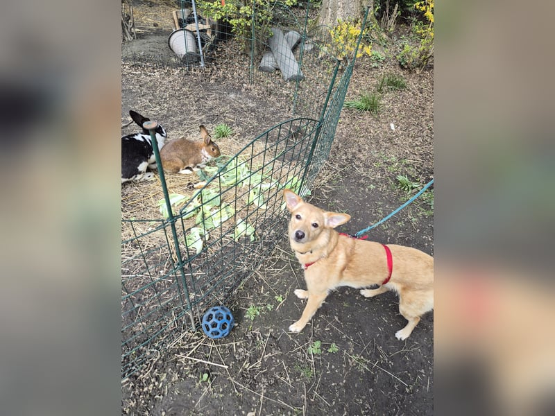 Sie hat bisher keinen Jagdtrieb und bleibt vor den Kaninchen sitzen.