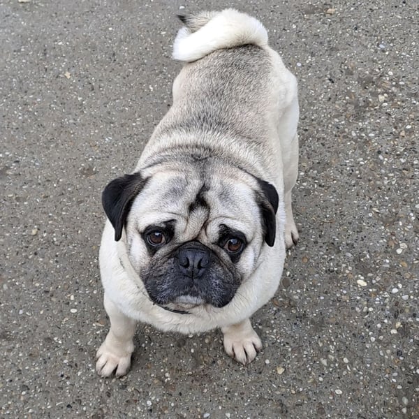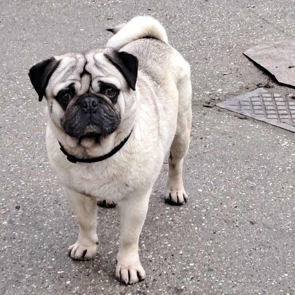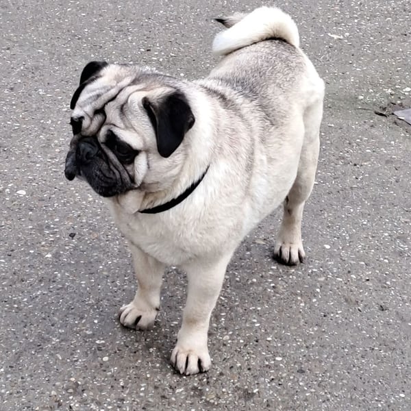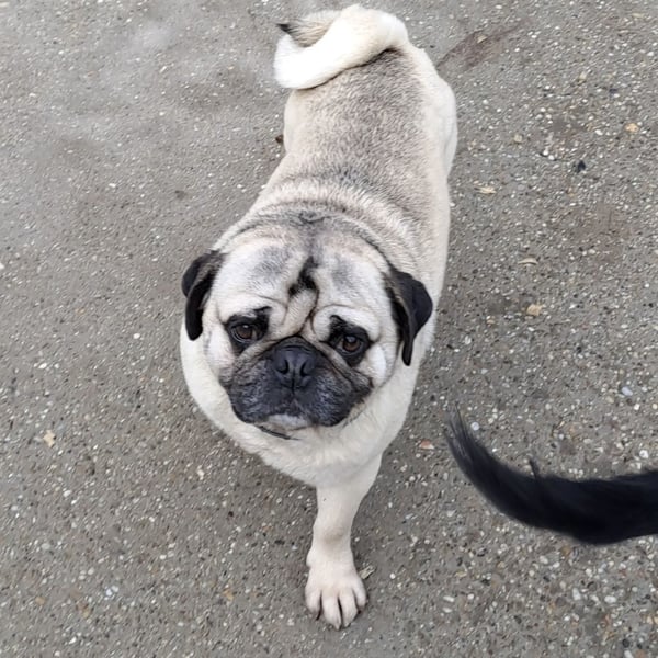 Er kommt mit allen Hunden gut aus. Allerdings ist er etwas größer als ein Standard Mops.