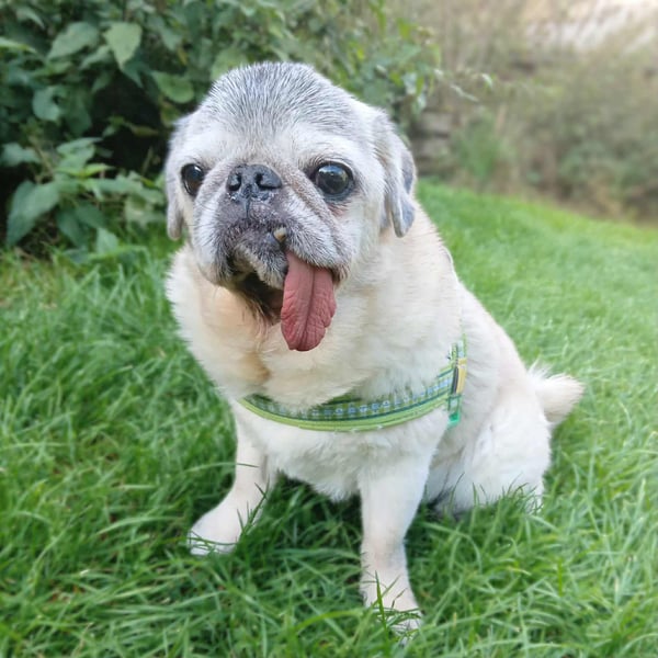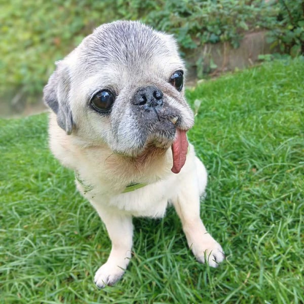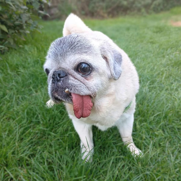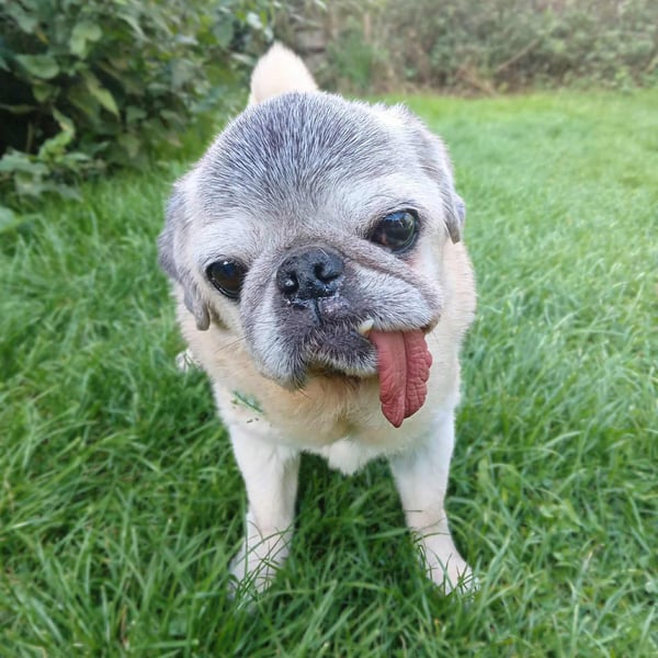 Aufgrund ihres Alters und der qualzucht-bedingten Brachycephalie schafft Kiba draußen keine allzu langen Runden mehr, hat aber noch viel Spaß an kurzen Spaziergängen. Die Mops-Omi ist laut tierärztlicher Untersuchung soweit fit. Sie hat nur ein kleines Fettgeschwulst, das weiter beobachtet werden sollte. Da sie nicht mehr viele Zähne hat, hängt ihre Zunge raus und sollte regelmäßig befeuchtet werden.