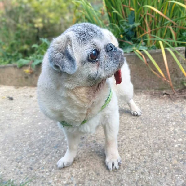 Mops-Omi Kiba wartet in 36323 Grebenau.