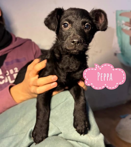 Peppa ist ein Mädchen, sie ist laut Tierarztschätzung ca. 4 Monate alt (geb. 30.07.2025), wiegt zur Zeit ca. 4 kg und ist etwa 25 cm groß. Sie ist ein unbekannter Mischling, wobei vermutet wird, dass vielleicht etwas Mudi oder Kroatischer Schäferhund in ihr steckt. Ausgewachsen wird sie aber viel kleiner, laut Tierarzt, vielleicht nur ca. 10kg.
