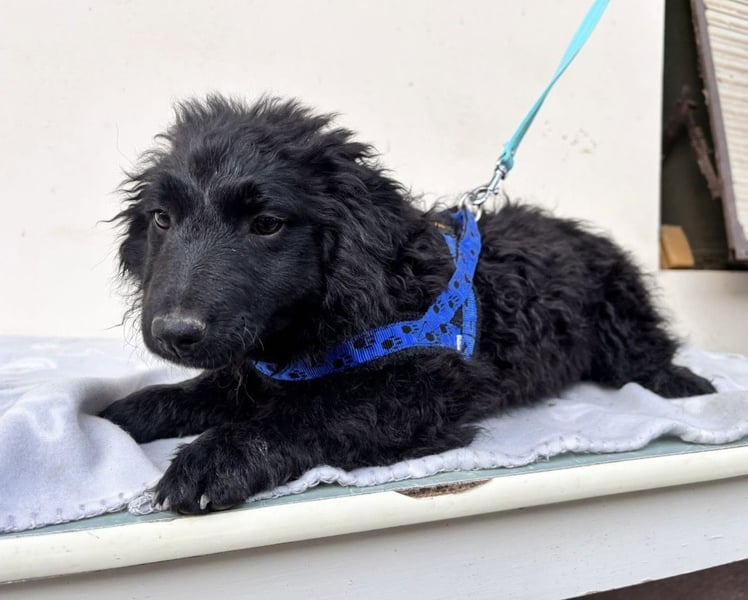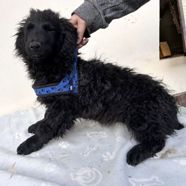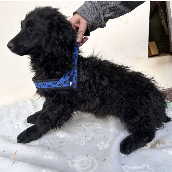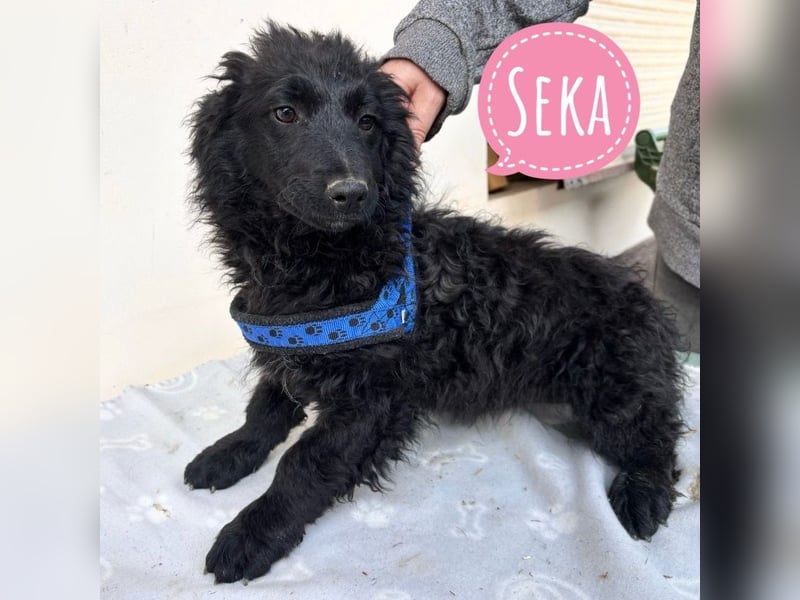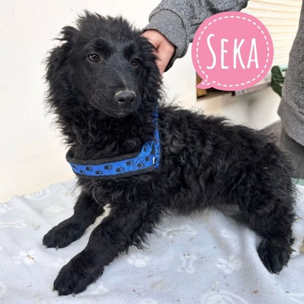 Seka ist ein Mädchen, sie ist laut Tierarztschätzung ca. 4 Monate alt (geb. 05.12.2025), wiegt 7,5kg und ist 28cm groß. Vermutet wird ein Pulin/Mudi Mischling, wobei sie sehr kurze Beine hat, sodass angenommen wird, dass in der Vergangenheit auch eine kurzbeinige Rasse beteiligt war. Eine Schwester hat sogar Züge von einem Sarplaninac. Über Generationen sind also absolute Querbeet Mischlinge entstanden. Seka wird ausgewachsen voraussichtlich ca. 15kg erreichen. Sie ist mit ganz kurzen Rute geboren.