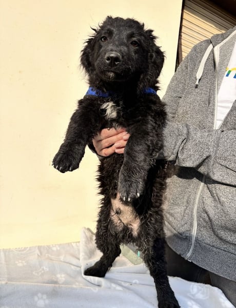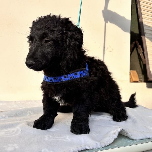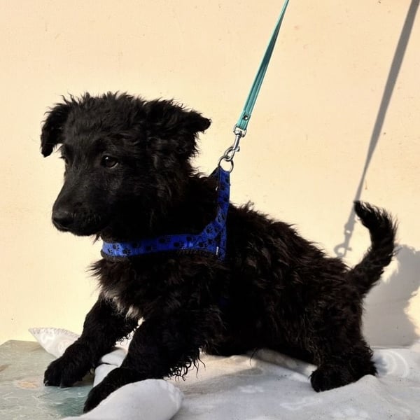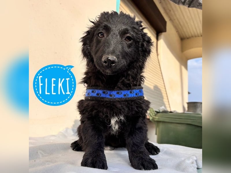 Fleki ist ein Bub, laut Tierarztschätzung ca. 4 Monate alt (geb. 05.12.2025), wiegt 7,2 kg und ist 28 cm groß. Vermutet wird ein Mudi/Pulin - Dackel Mischling. Er hat kurze Beinchen, ausgewachsen wird er voraussichtlich ca. 15kg mit max. 35-40cm Schulterhöhe.
