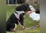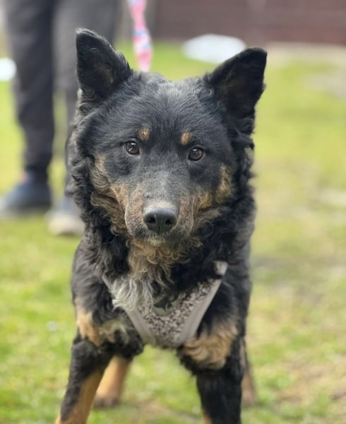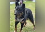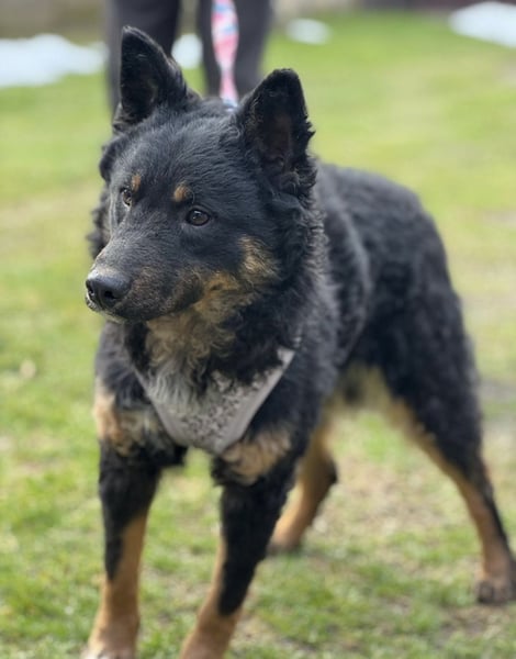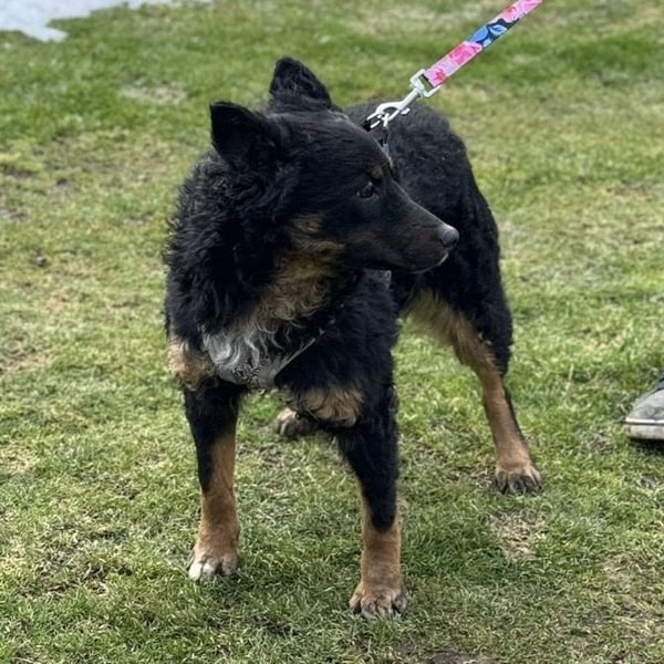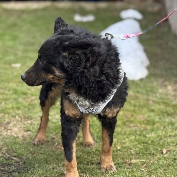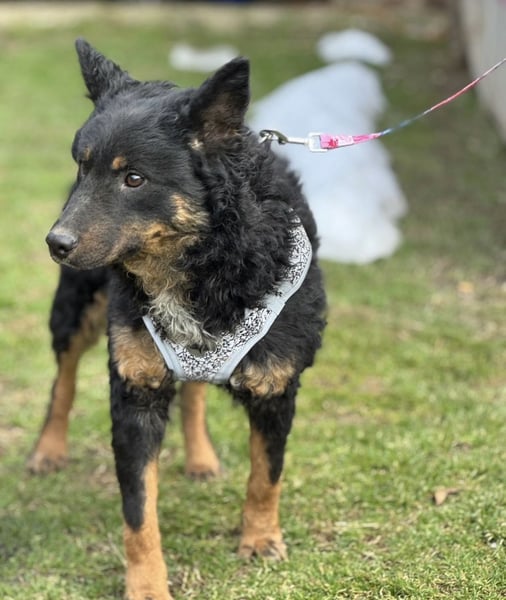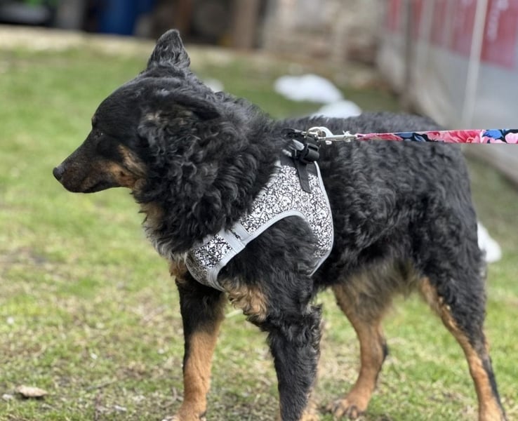 Bessie ist ein Mädchen, sie ist laut Tierarztschätzung ca. 10 Monate alt (geb. 15.03.2025), 45 cm groß und wiegt 14 kg. Vermutet wird ein Mudi - Kroatischer Schäferhund Mischling. Sie wurde auch rassentypisch ohne Rute geboren.
