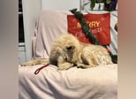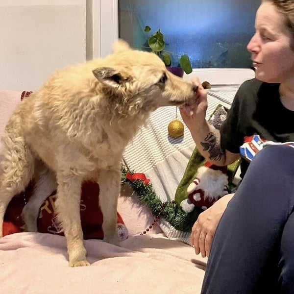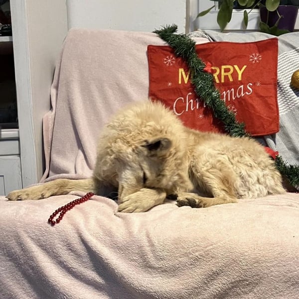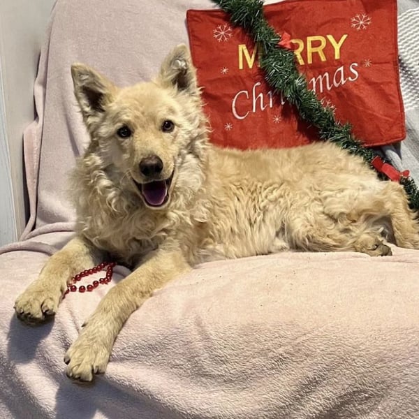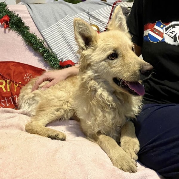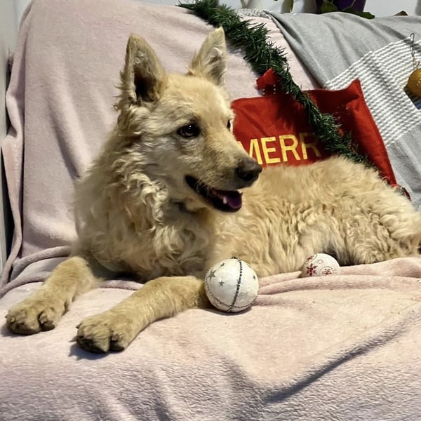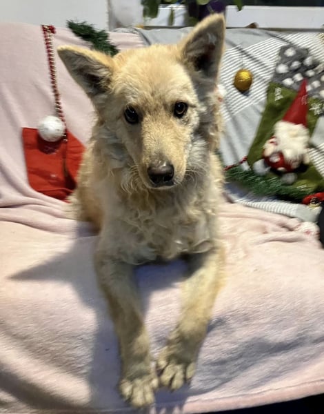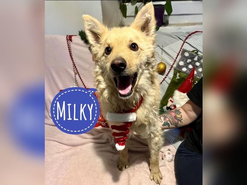 Milky ist ein Bub, er ist ca. 1,5 Jahre alt (geb. 20.07.2023), wiegt nur 14,5kg und ist 51cm groß. Vermutet wird ein Creme Mudi. Er ist rassentypisch ohne Rute zur Welt gekommen.