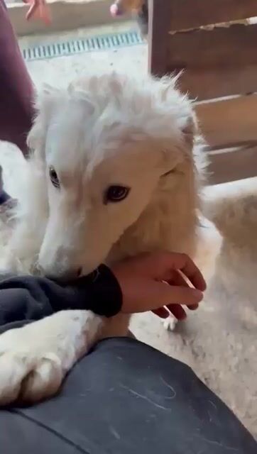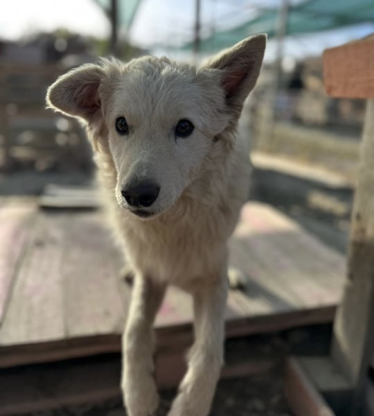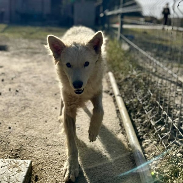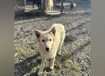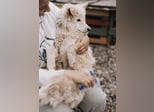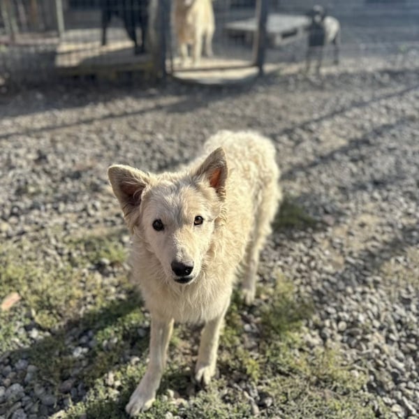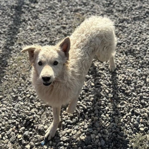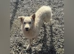 Vermutet wird ein cremefarbener Mudi-Samojede Mix, ohne Rute geboren.