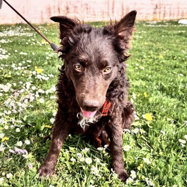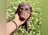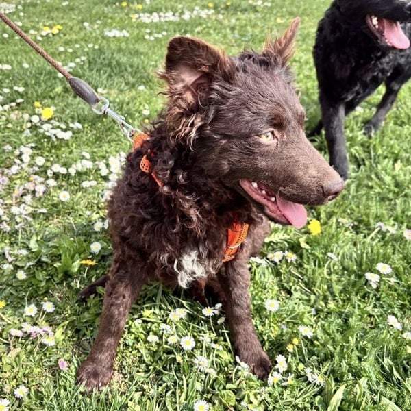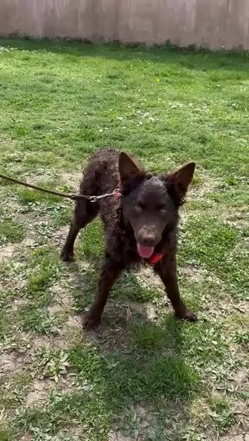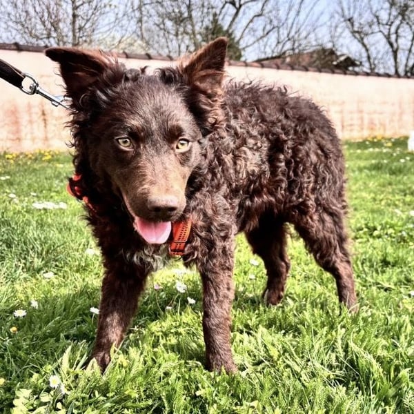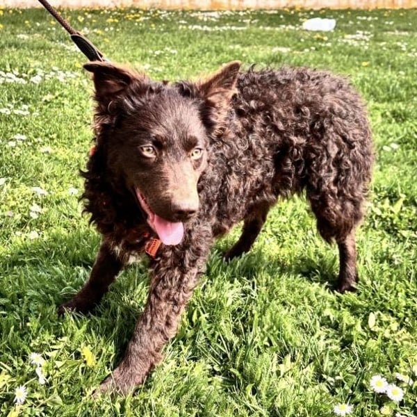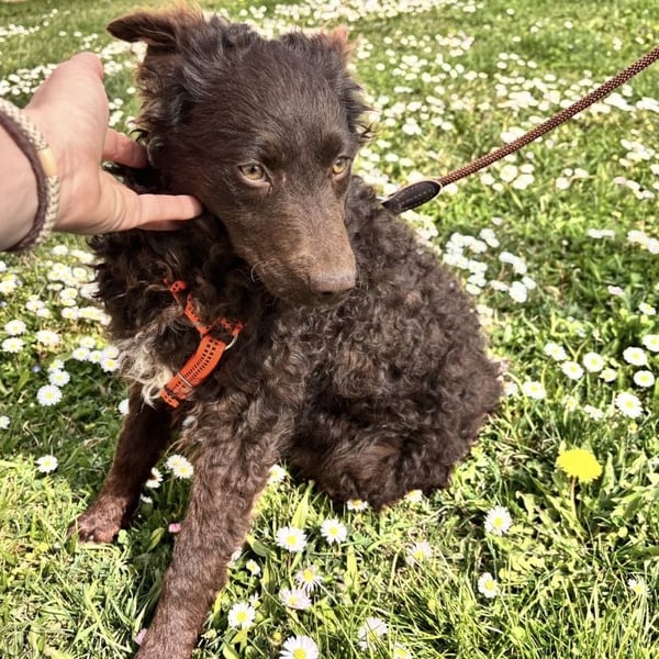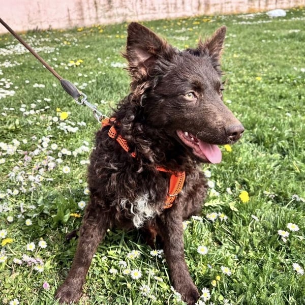 Kava ist ein Mädchen, laut Tierarztschätzung ca. 5 Monate alt (geb. 02.11.2025), wiegt 10,4 kg und ist 34 cm groß. Ausgewachsen wir sie eine perfekte Mudi-Mittelgroße haben, mit Kopf bis zum Knie. Sie hat ein wunderschönes Schokoladenfarbenes lockiges Fell.