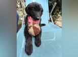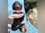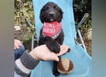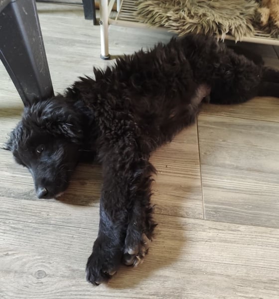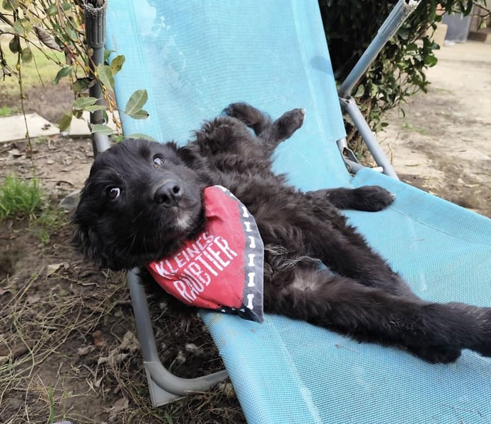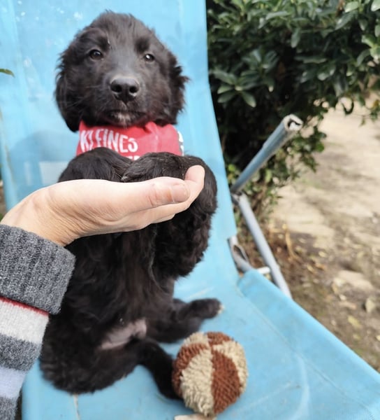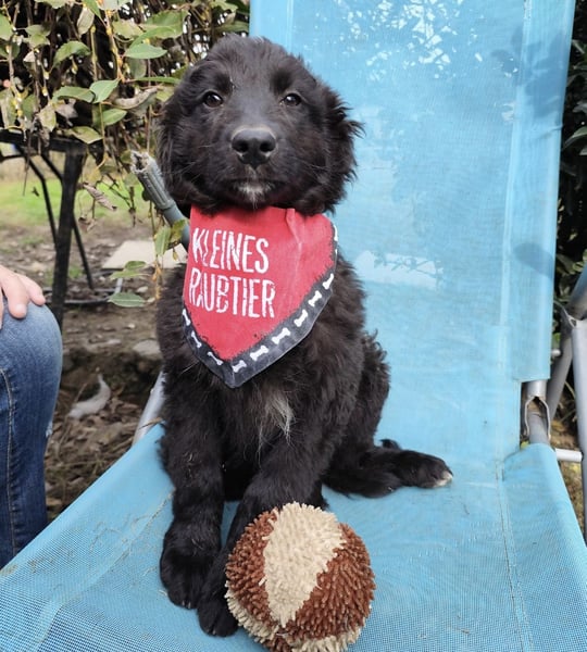 Kiko ist ein Bub, laut Tierarztschätzung knapp 5 Monate alt (geb. 11.06.2025). Er wiegt 7 kg und ist 35 cm groß. Vermutet wird ein Mudi-Tornjak-Mischling, und da er viel kleiner als seine Schwester ist, wird er ausgewachsen etwa 20 kg erreichen.