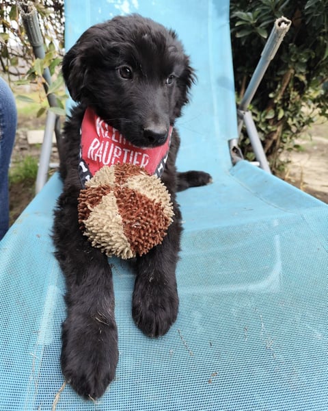 Er zeigt ein sehr stabiles und ausgeglichenes Wesen, ist verschmust und freundlich, anfangs nur leicht zurückhaltend – ganz typisches Verhalten für ein junges Hundekind. Im Haus schläft er die meiste Zeit, nutzt den Welpenunterleger zum Pinkeln, wobei das immer seltener nötig ist. Er ist schlau und lernt schnell. Draußen spielt er fröhlich mit dem Rest des Rudels.