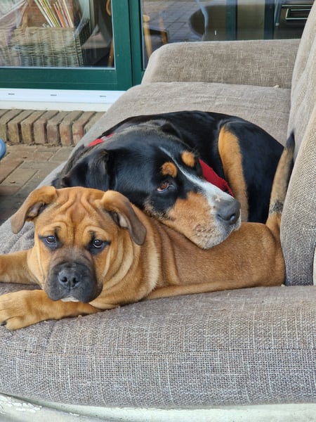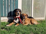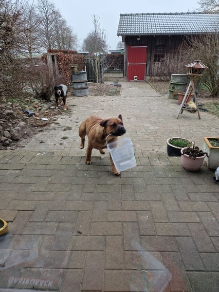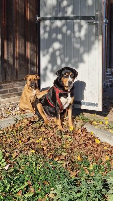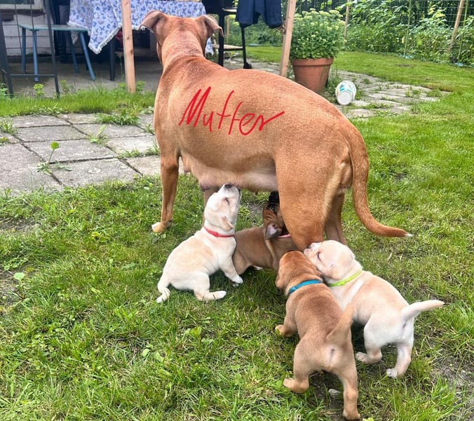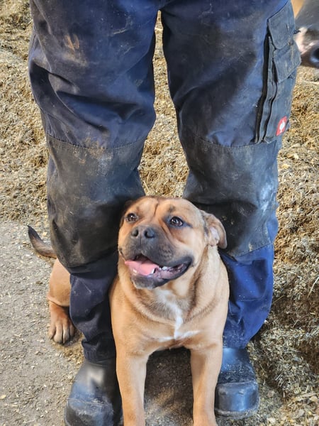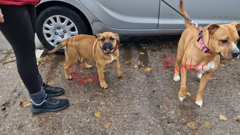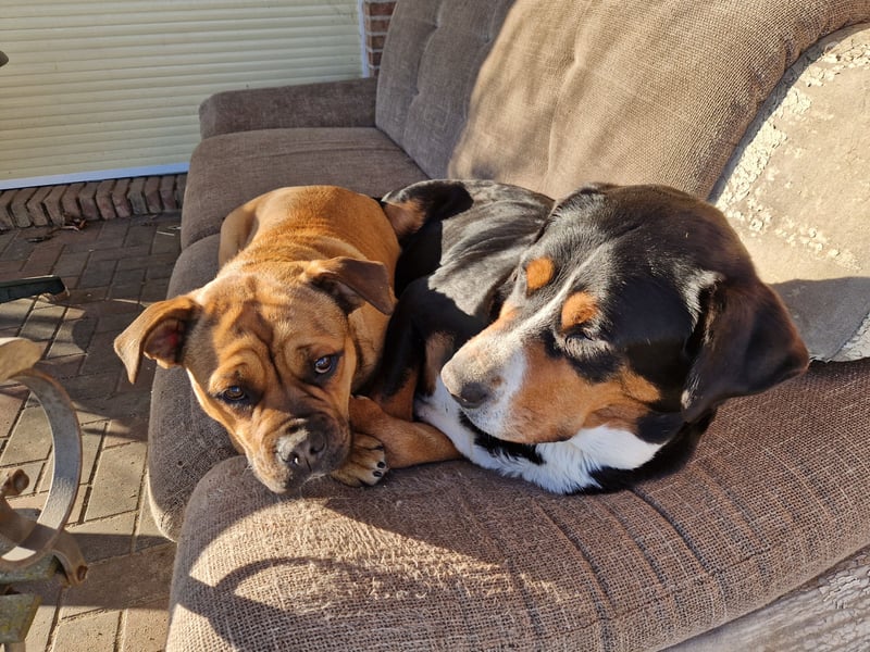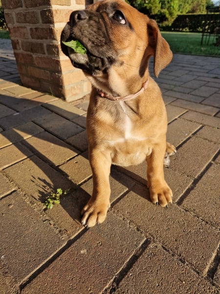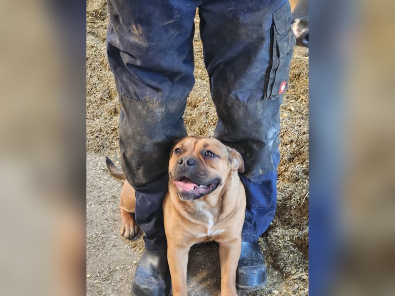Kyra ist ein aufgeweckter Mischling aus Old English Bulldog und Labrador. Wir haben sie als Welpen bekommen, und sie ist von Anfang an gemeinsam mit unserer großen Hündin aufgewachsen.