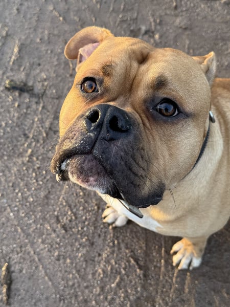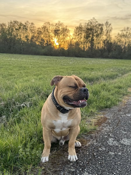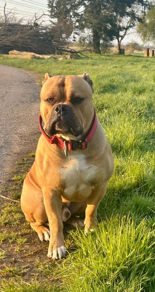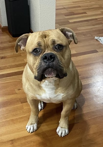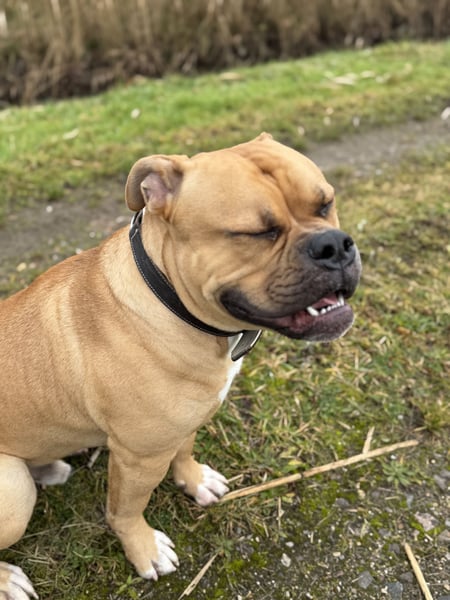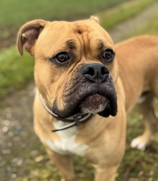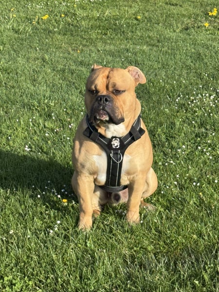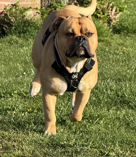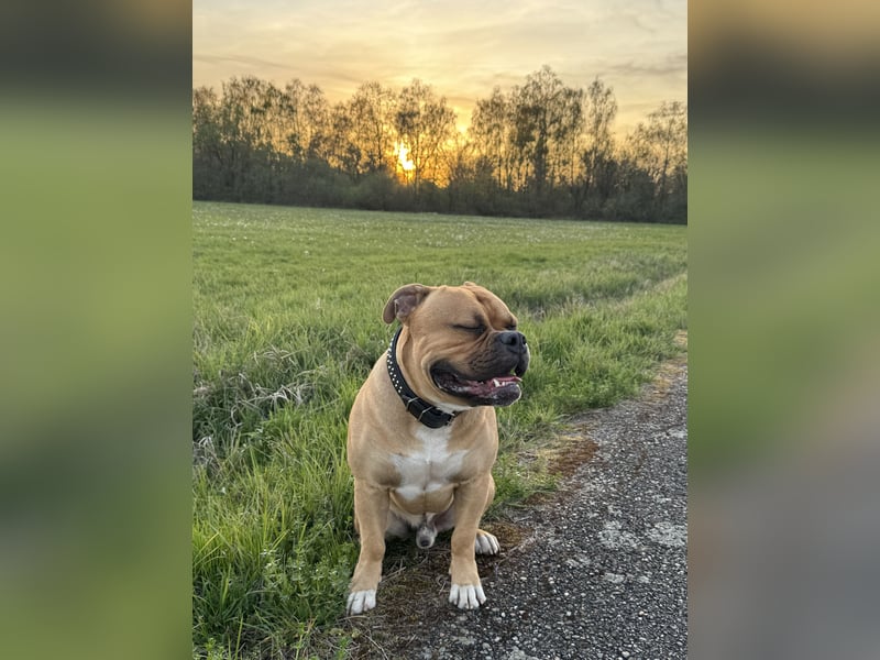 Wir bieten unseren reinrassigen Old English Bulldog als Deckrüde an. Farbe Blue Fawn.