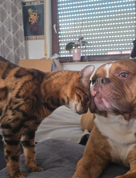 Er versteht sich mit unserer Katze, da er mit ihr aufgewachsen ist. Für andere Katzen kann ich nichts sagen.