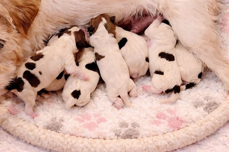 Es sind 3 Rüden und 4 Hündinnen in den Farben braun-weiß, tricolor und schwarz-weiß.