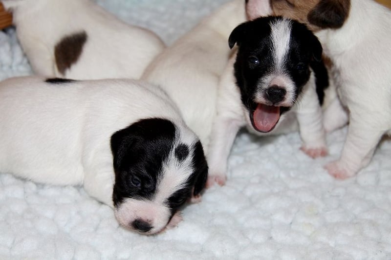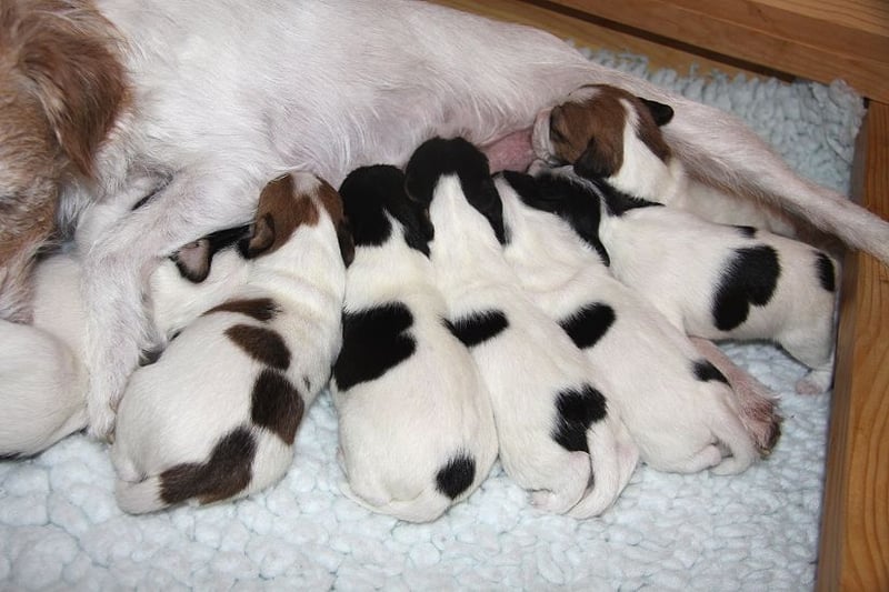 Es sind 3 Rüden und 4 Hündinnen in den Farben braun-weiß, tricolor und schwarz-weiß.