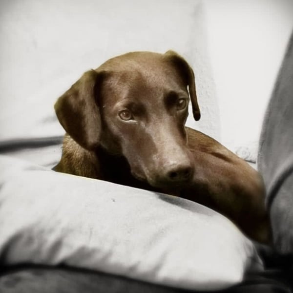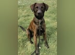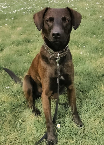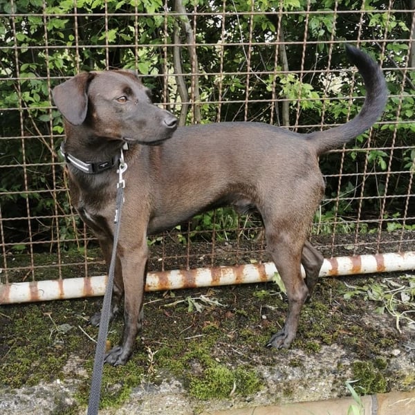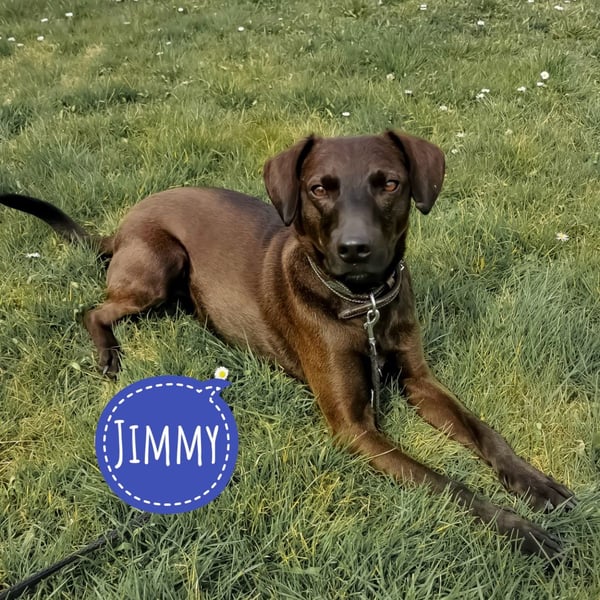 Jimmy ist ein Bub, ca. 3,5 Jahre alt (geb. 25.08.2021), wiegt ca. 15kg und ist 45cm groß, vermutet wird ein Schockobrauner Labrador - Patterdale Terrier Mix.