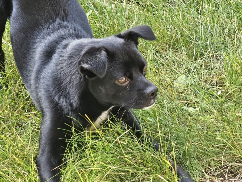 Ein souveräner Hundekumpel im neuen Zuhause wäre ideal für ihn, denn Onyx orientiert sich stark an anderen Hunden und möchte mit ihnen spielen. Verkehr findet er noch etwas gruselig – besonders große Traktoren oder laute Fahrzeuge. Wenn jedoch ein anderer Hund gelassen bleibt, beruhigt ihn das sehr.