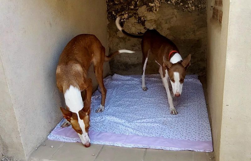 Mit Artgenossen ist Ayla sehr gut verträglich. Sie zeigt sich sozial, ruhig und ausgeglichen im Umgang mit anderen Hunden und orientiert sich gern an ihren vierbeinigen Freunden. Spaziergänge liebt sie – draußen blüht sie richtig auf. Sie läuft aufmerksam, schnüffelt neugierig und zeigt dabei den typischen, feinen Jagdinstinkt der Podencos.
