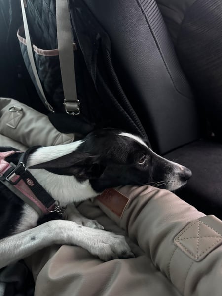 Auto fahren find ich cool! Stell mir ein Bettchen auf den Rücksitz und dort lieg ich genauso brav, wie ich darin nachts neben dem Bett darin liegen bleibe. Ich lerne wahnsinnig schnell und achte genau auf meine Menschen, denn ich möchte gefallen.