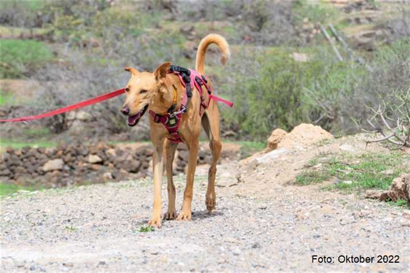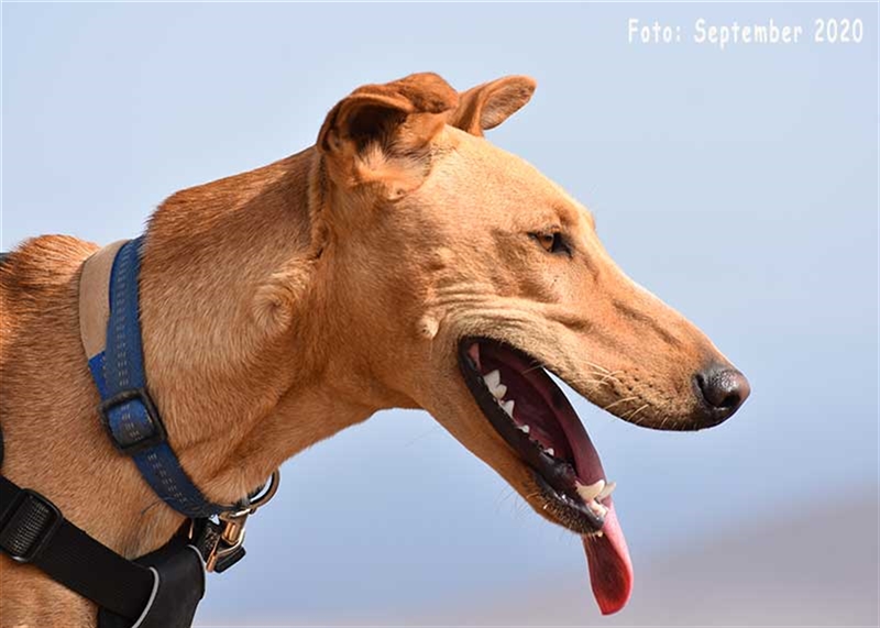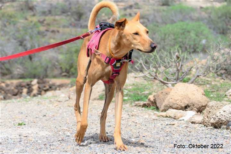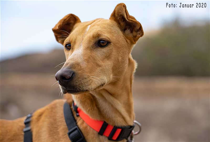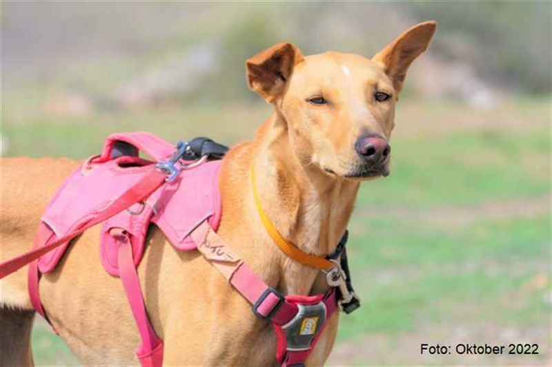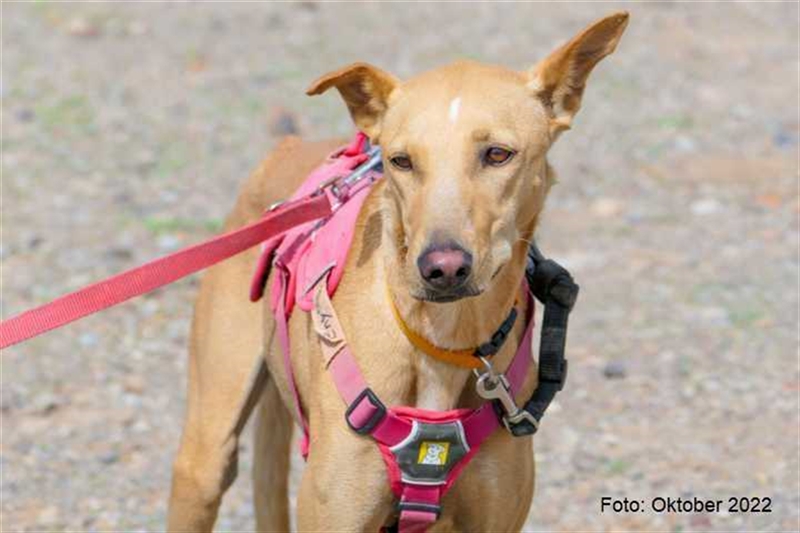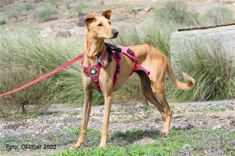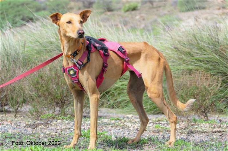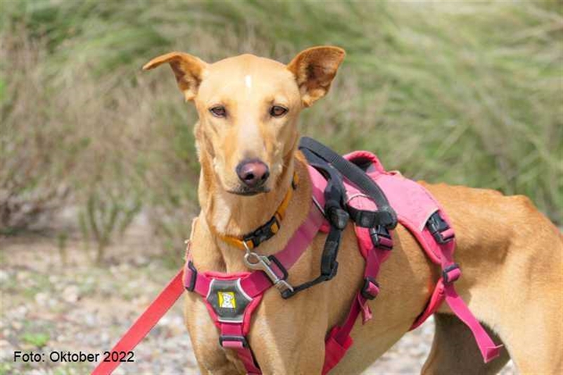 Bisher zeigt sie übrigens keinen ausgeprägten Jagdtrieb, obwohl sie Podenco-Gene in sich trägt. Dieser kann sich aber möglicherweise im neuen Zuhause noch entwickeln.