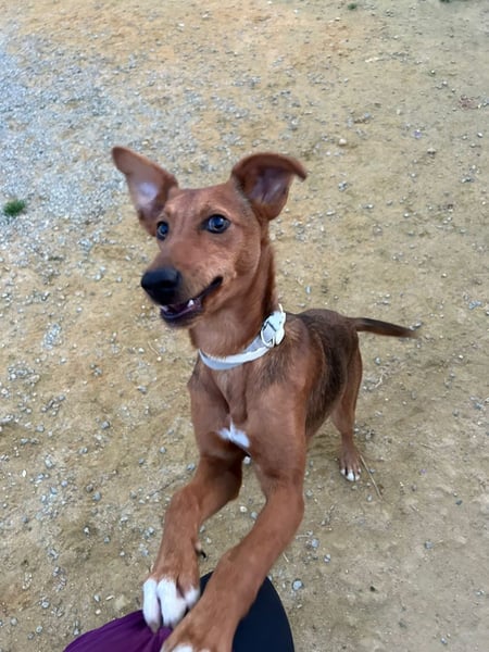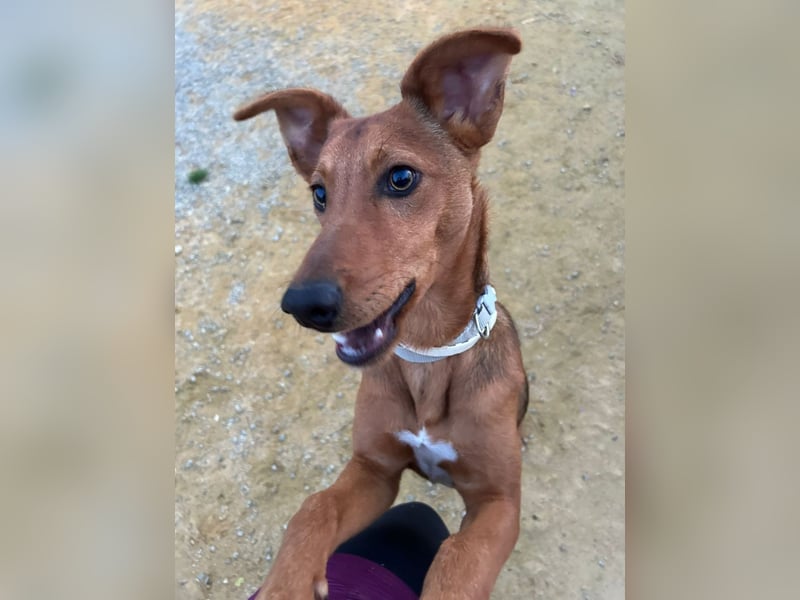 Tiki ist noch ein echter Jungspund – knapp ein halbes Jahr alt, neugierig auf die Welt und voller Lebensfreude. Mit aktuell etwa 50 cm Schulterhöhe und rund 12 kg Gewicht bringt er beste Voraussetzungen für einen zukünftigen Personal Trainer mit. Sein schlanker Körperbau lässt schon erahnen, dass hier ein kleiner Athlet heranwächst – typisch Podenco eben.