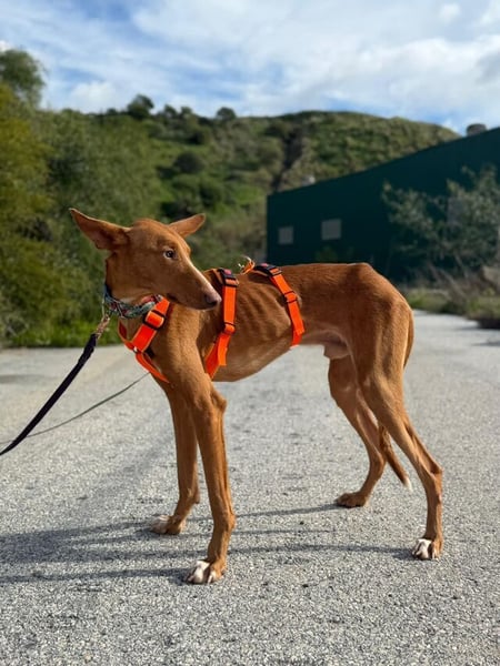 Arun (ca. 02/2023, ca. 64 cm) ist ein wunderschöner Podenco Canario, der Ende Januar 2026 in unser spanisches Partnertierheim TripleA in Marbella kam. Er war kurz vorm Verhungern und ungechipt – ein Schicksal, das er mit vielen Windhunden gegen Ende der Jagdsaison in Spanien teilt.