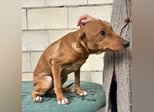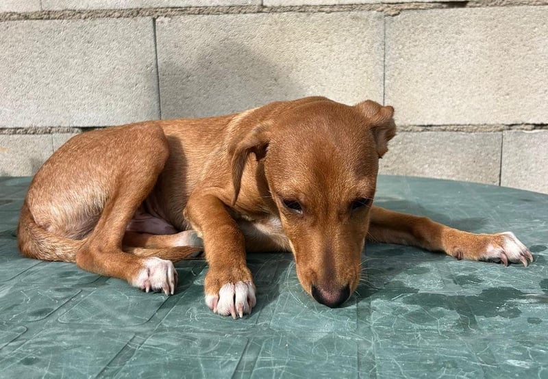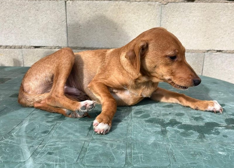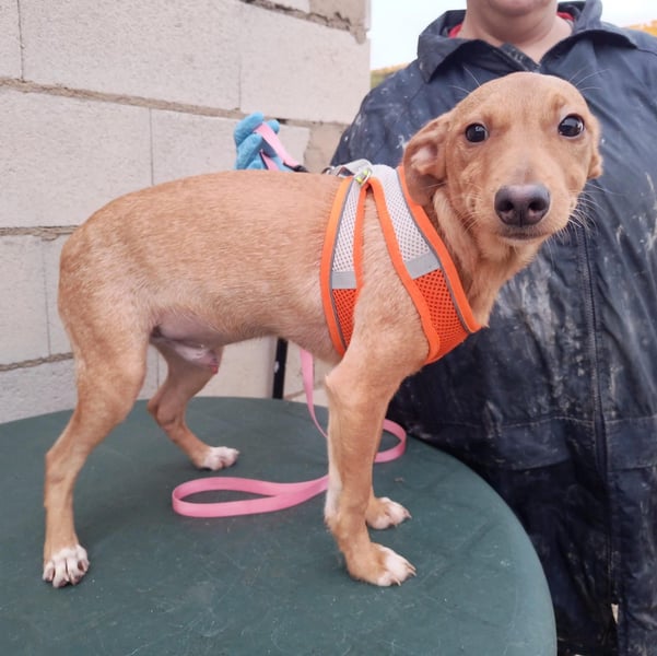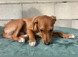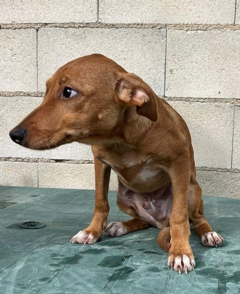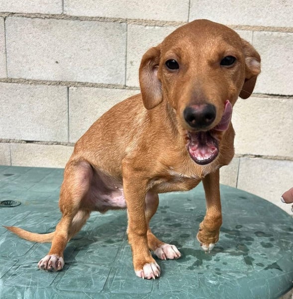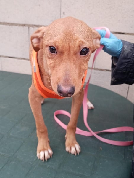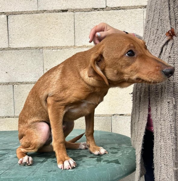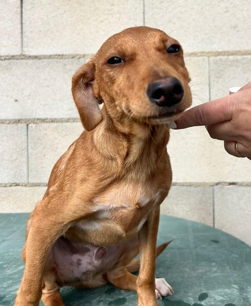 Der hübsche braune Tibs ist ein junger Podenco-Mix mit kleineren Beinchen, was ihm sein ganz eigenes, charmantes Aussehen verleiht. Momentan wiegt er etwa 5,5 kg, und wir schätzen, dass er später einmal ca. 40 cm Schulterhöhe erreichen wird.