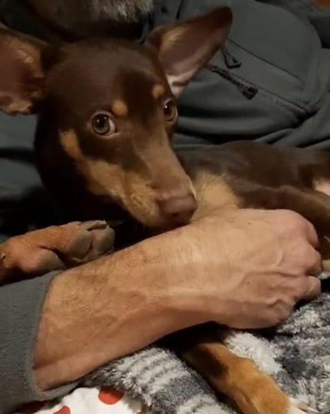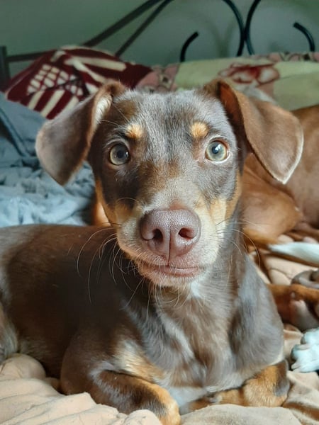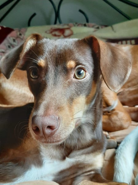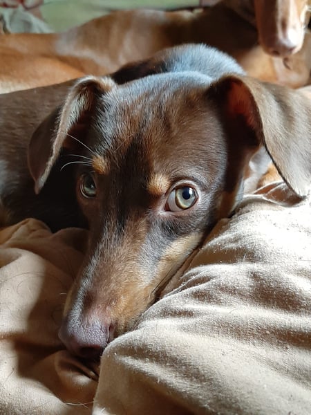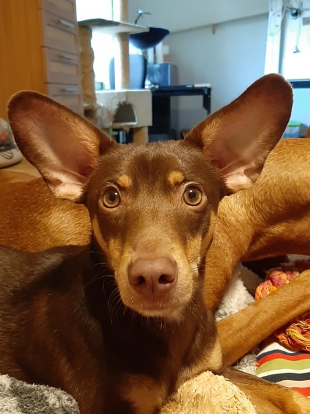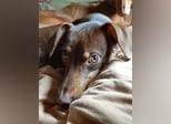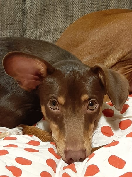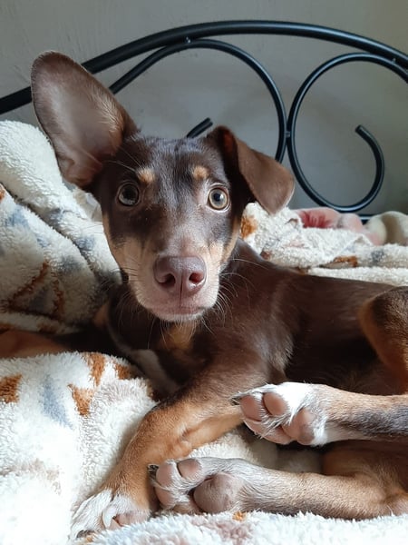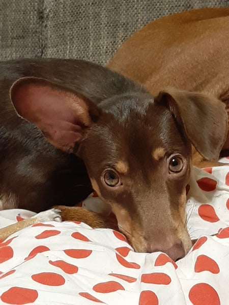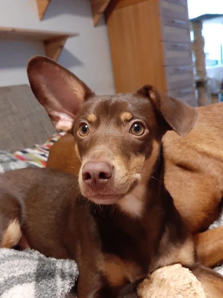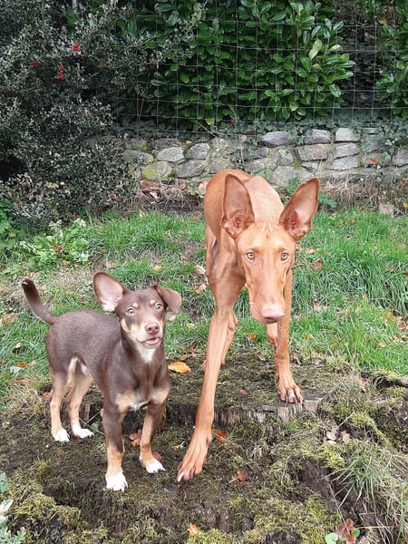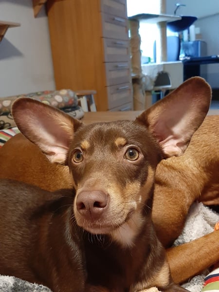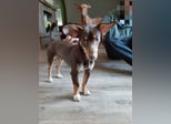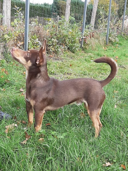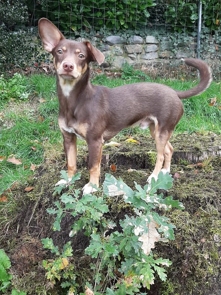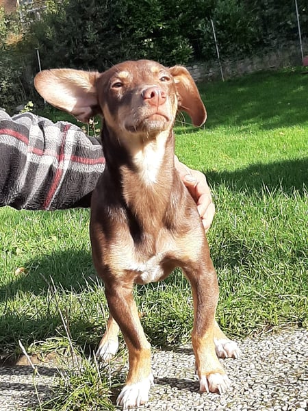 Pino, Podenco Maneto/ Dackel mix, geb. 28.2 25, nicht kastriert, ja. 30 cm, ca 6,5 kg Mittelmeercheck mit ca. 1 Jahr erst dann sinnvoll.