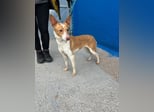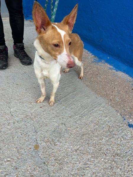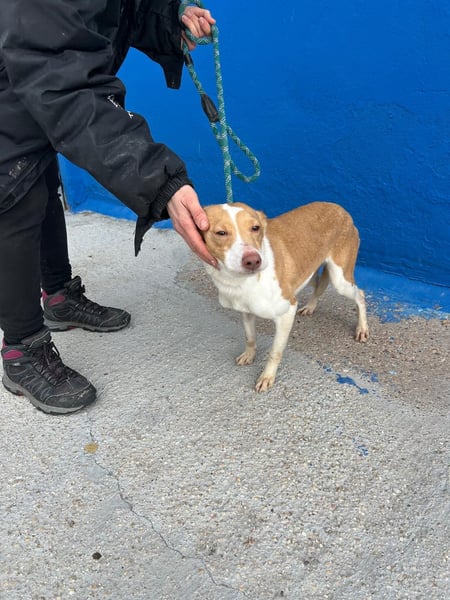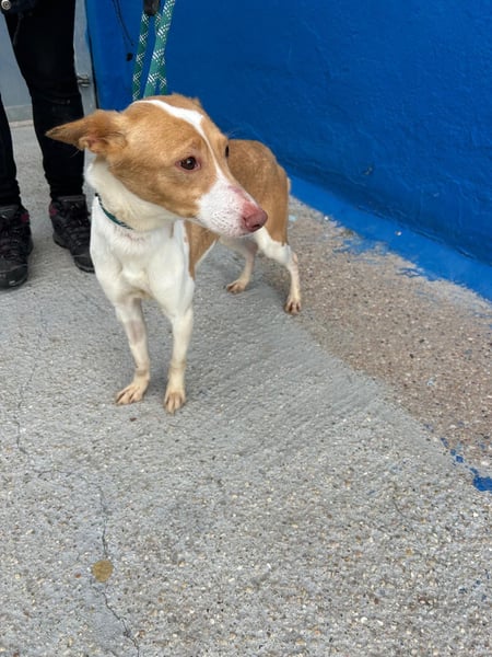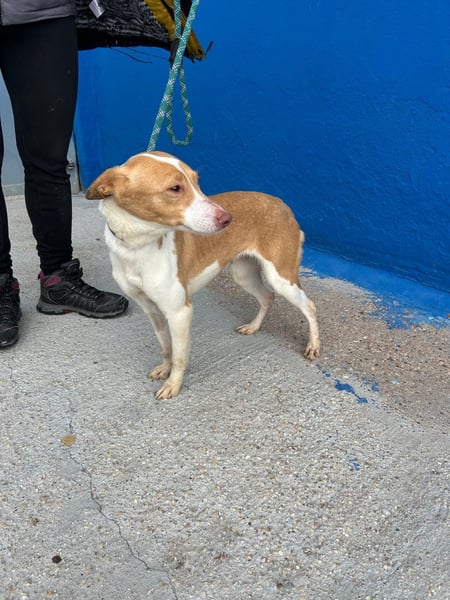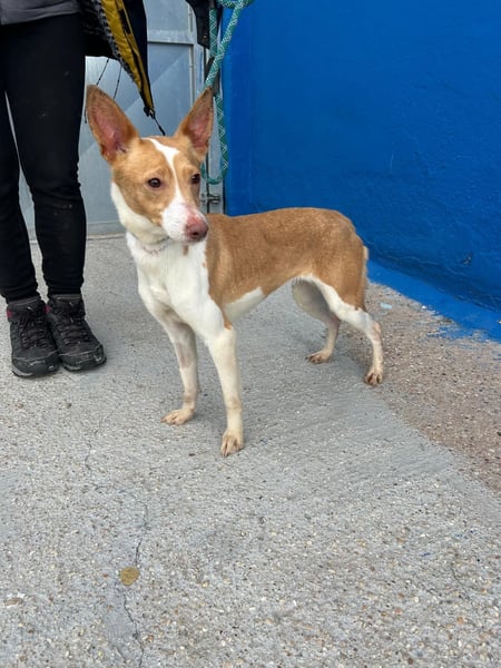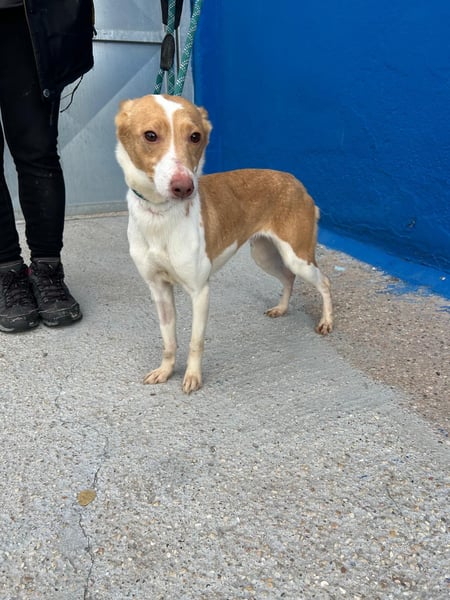 Die zarte, weiß-hellbraune Podenca Nayra, geboren ca im April 2023, wartet derzeit in Burgos, Spanien, auf Menschen, die ihr endlich zeigen, wie schön ein behütetes Leben sein kann.