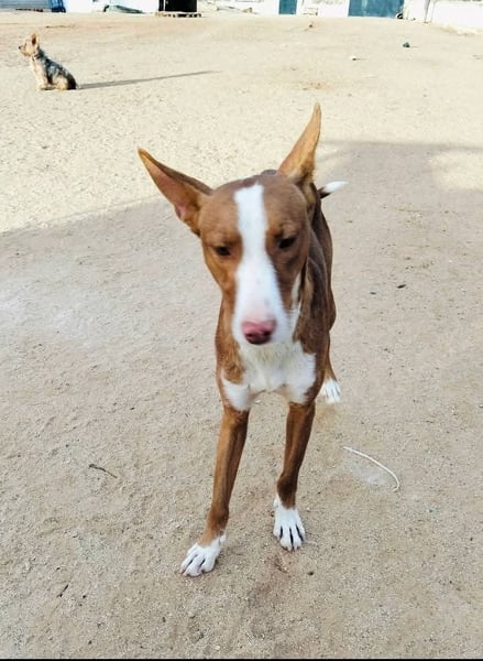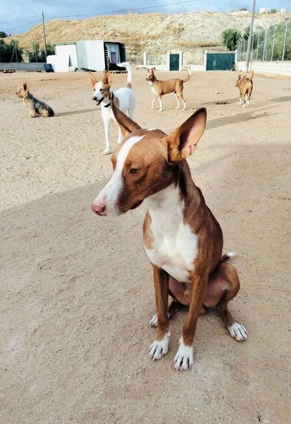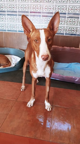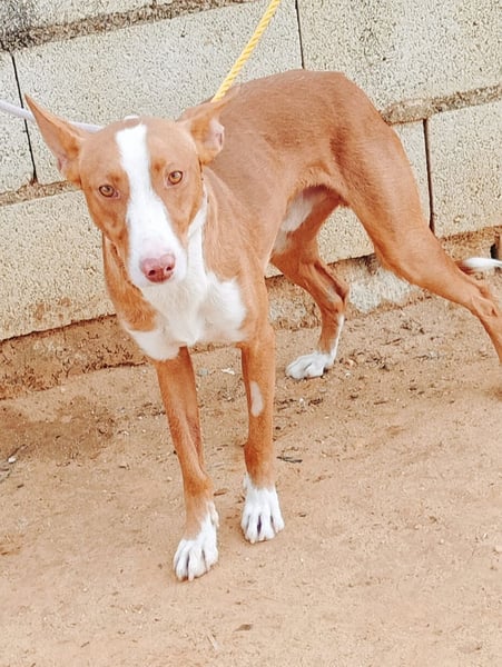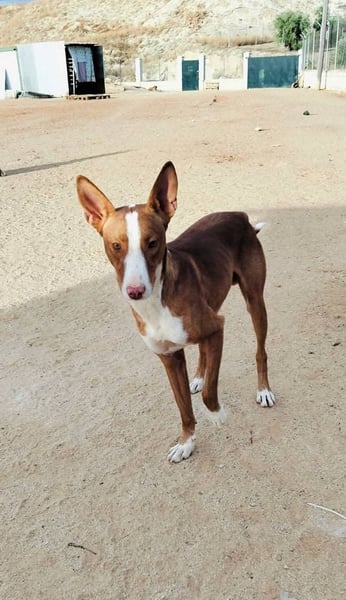 Turron ist ein bildschöner, rot-weißer Podenco-Rüde mit äußerst kommunikativen Stehohren und faszinierenden dunkelgrünen Augen, die ihrem Gegenüber direkt in die Seele schauen. Mit etwa 2 Jahren und einer Schulterhöhe von 50 cm bringt Turron die perfekte Mischung aus jugendlicher Energie und angenehmer Größe mit. Sein Fell glänzt in warmen Rottönen, die weißen Abzeichen unterstreichen seine elegante Erscheinung – ein echter Hingucker für Podenco-Liebhaber und alle, die es werden wollen.