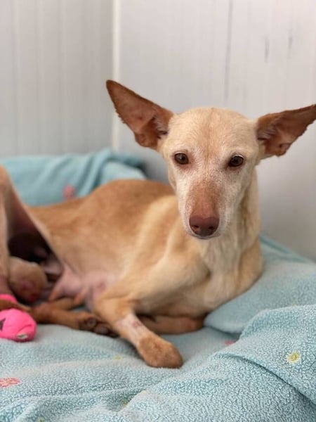 Lucia (*ca. 01/2018, ca. 49 cm) kam in einem schlechten Zustand in unser spanisches Partnertierheim Triple A Marbella. Ausgemergelt, mit einem lange unbehandelten Bruch im Bein und hochtragend – ihr körperlicher Zustand spiegelte ihre schwierige Vergangenheit deutlich wider. Doch kaum war sie angekommen und spürte, dass sie in Sicherheit ist, begann sie noch am selben Tag mit der Geburt ihrer Welpen. Leider kam es zu Komplikationen, sodass sie in die Notfallklinik gebracht werden musste. Dort konnten die verbliebenen, lebenden Welpen zur Welt gebracht werden und Lucia wurde gleichzeitig ihre infizierte Gebärmutter entfernt.