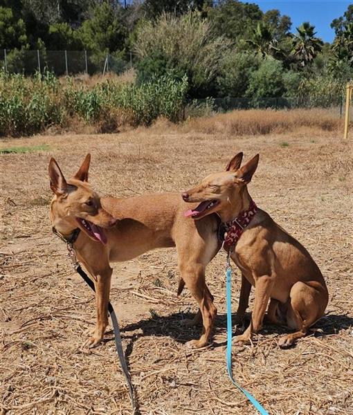 Die beiden sehr schönen, zierlichen Podenco-Mädchen lieben es mit ihren Hundefreunden im Auslauf zu laufen. Die Anwesenheit anderer Hunde gibt ihnen Selbstvertrauen. Wenn sie mit anderen Hunden zusammen sind, laufen sie sogar schon recht gut an der Leine. Wenn sie von der Gruppe getrennt sind, werden sie sehr nervös.