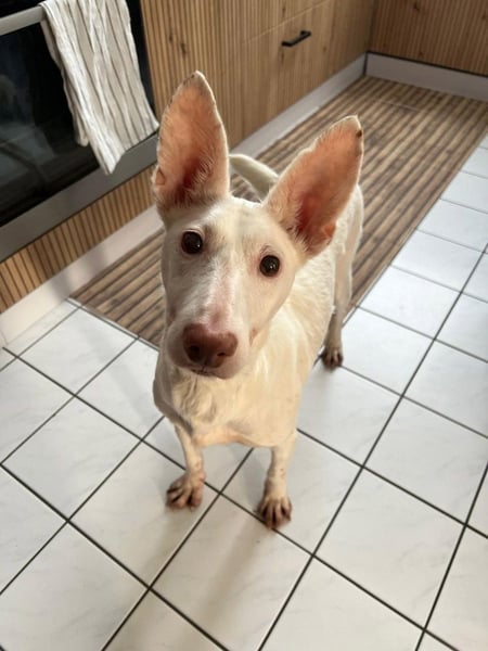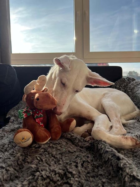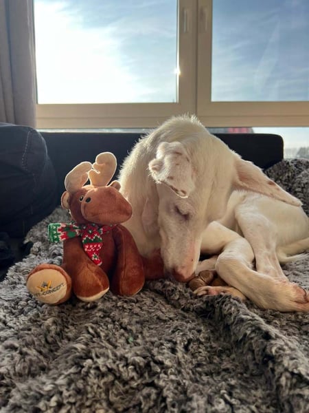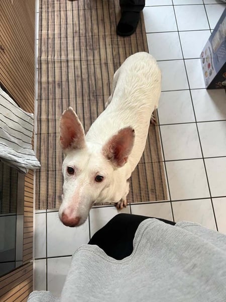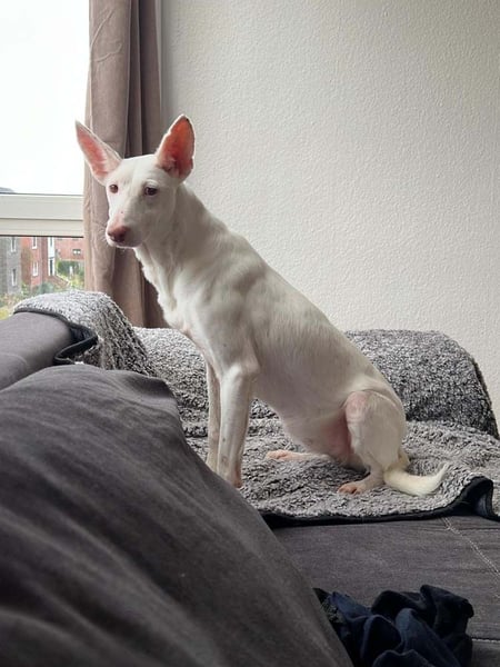 So richtig weiß die süße Susona noch nicht, was sie von dem kleinen Stoffelch halten soll. Also erst einmal vorsichtig beschnüffeln, vielleicht ist es ja ein neuer Freund? Auf den Fotos wird sehr deutlich, was diese liebe, schneeweiße Podenca besonders mag: auf einem weichen Sofa kuscheln. Wer bereits diese besondere Rasse kennt, weiß, dass ein kuscheliges Plätzchen das größte Glück für jeden Podenco ist, vorausgesetzt natürlich er bzw. sie hat ein schönes Zuhause. Für Susona hoffen wir, dieses neue, schöne Zuhause zu finden. Beim Fotoshooting zeigt sie sehr freundlich-selbstbewusst, was für ein besonderer Schatz sie ist. Mit ihren großen Ohren wird ihr absolut nichts entgehen. Typisch Podenco ist sie intelligent, sehr feinfühlig, aufmerksam und neugierig. Diese Rasse wurde für die Jagd gezüchtet, um z.B. Kaninchen aufzustöbern und dem Jäger lebend zu bringen. Sie jagen mit allen Sinnen und sind niemals aggressiv. Sie brauchen die Gesellschaft von Menschen und sehr gerne auch die von anderen Hunden. So ist es auch bei Susona. Ob sie jemals gejagt hat, ist nicht bekannt.