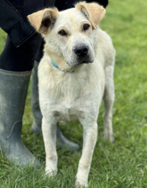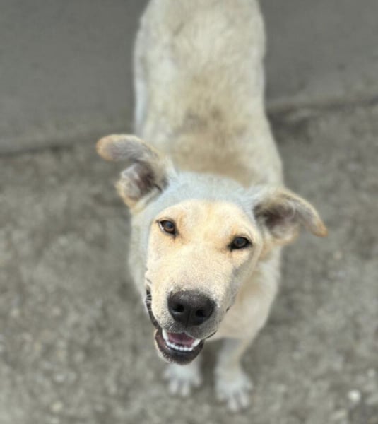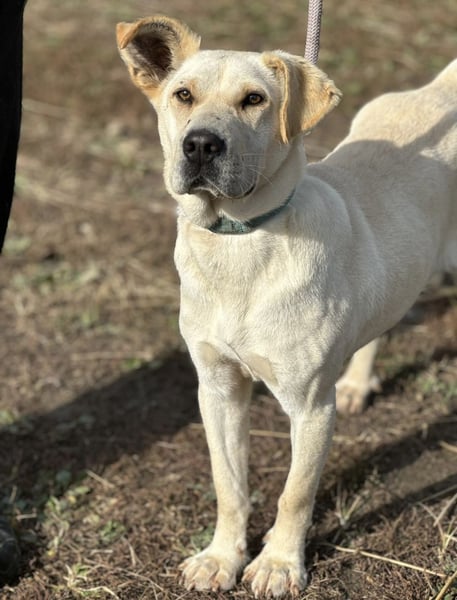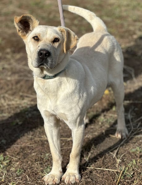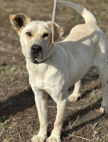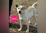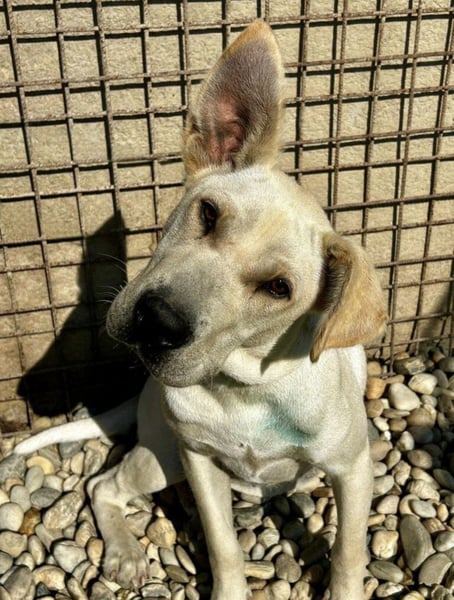 Capona ist laut Tierarztschätzung ca. 1,5 Jahre alt (geb. 07/2024), etwa 58 cm groß und wiegt rund 22 kg. Vermutet wird ein Podenco-Labrador Mischling.