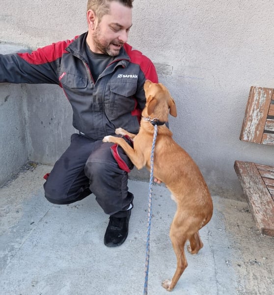 Der kleine Kerl freut sich sehr überschwänglich über Menschen, denen er am liebsten ganz nah sein will.