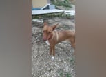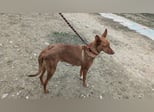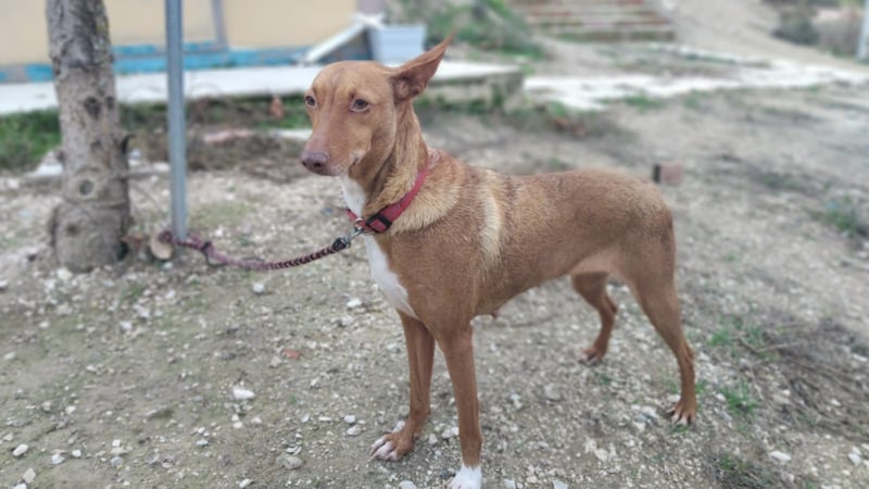 Ween ist eine wunderschöne braun-weiße Podenco-Hündin, geboren etwa im Oktober 2023.