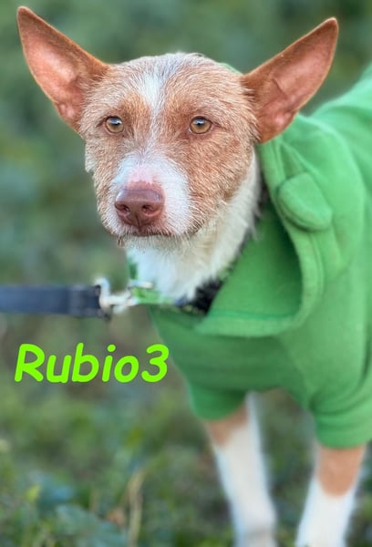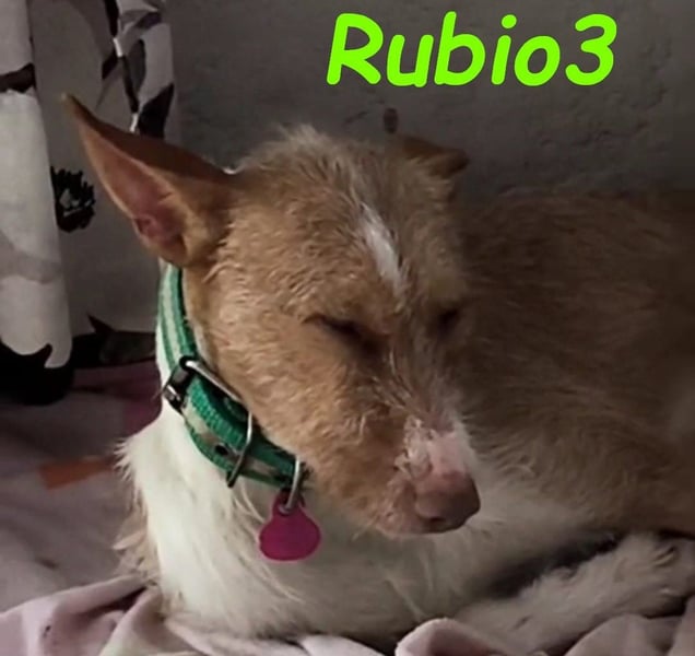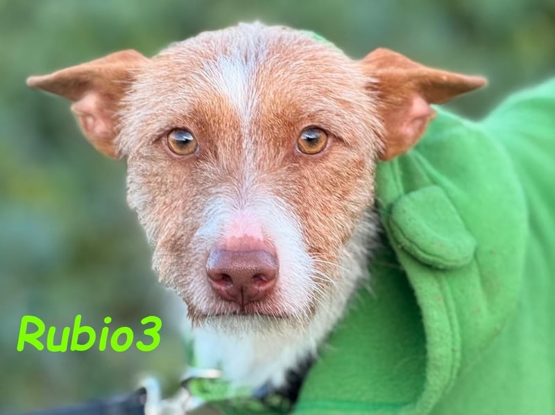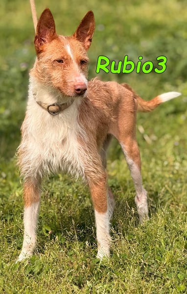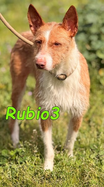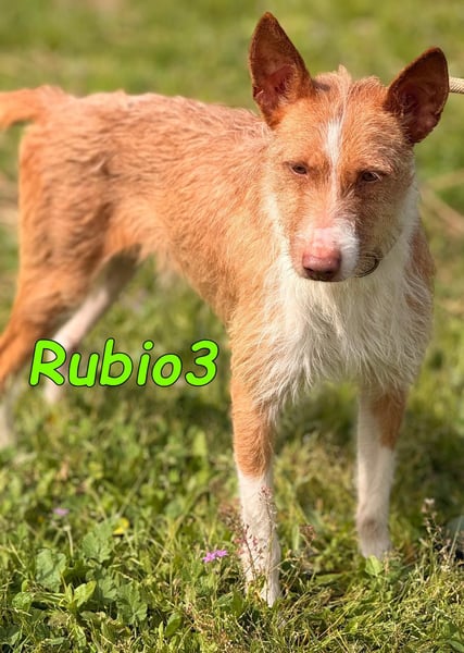 Rubio3 ist ein freundlicher, sozialer Rüde, der sich sowohl mit Menschen als auch mit anderen Hunden sehr gut versteht. Rubio3 wurde auf einem Feld schwer verletzt gefunden. Sein Oberschenkel war aus dem Hüftgelenk ausgekugelt, der Hüftkopf bereits nekrotisch vermutlich die Folge eines Tritts oder eines Autounfalls. Rubio3 wurde ganz schnell operiert und erholt sich gerade von der OP. Die beste Medizin für Rubio3 ist nun die Chance auf eine eigene Familie, bei der er ankommen und glücklich werden darf.