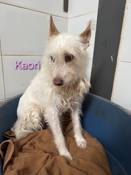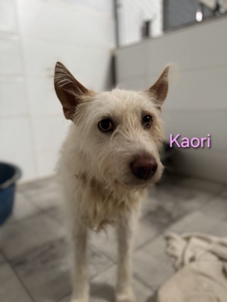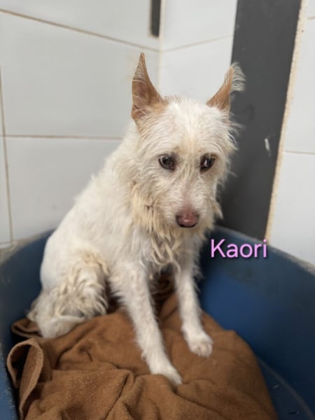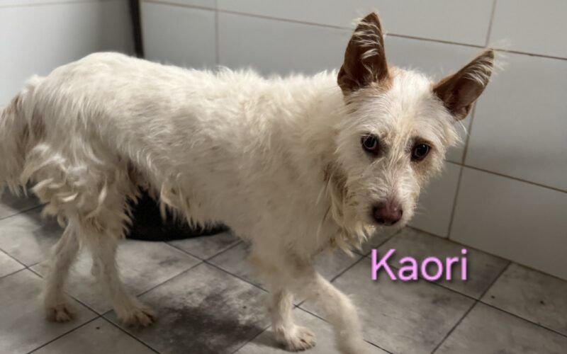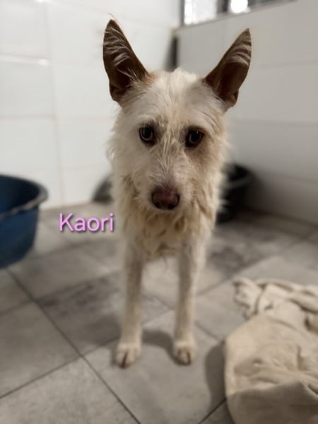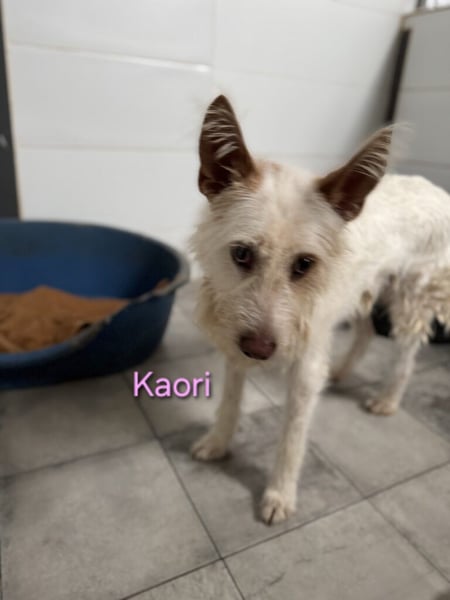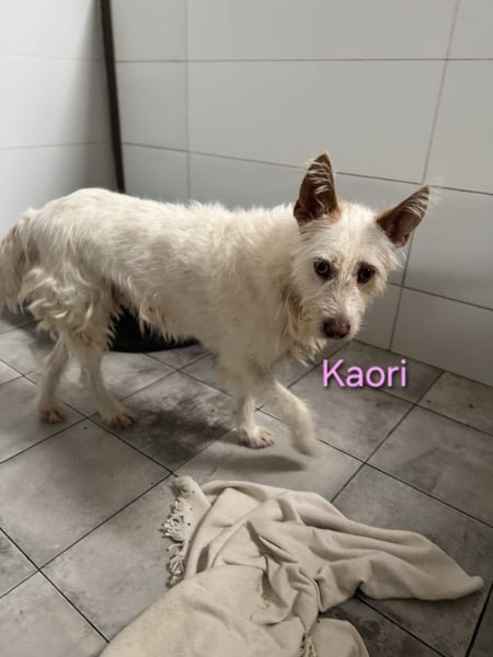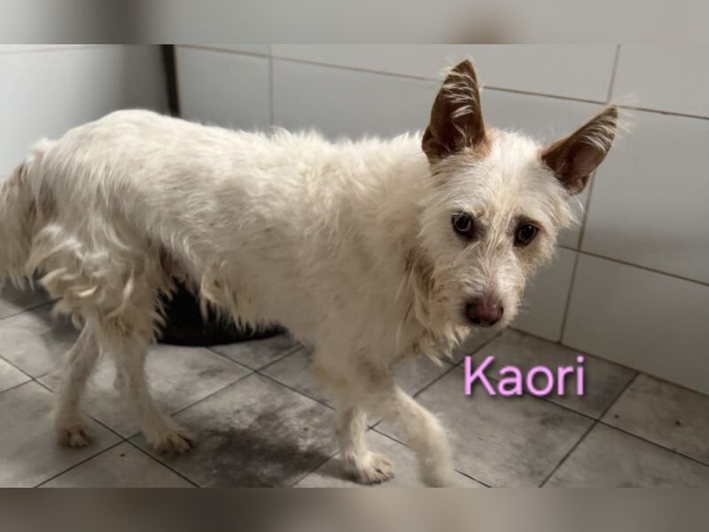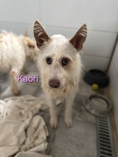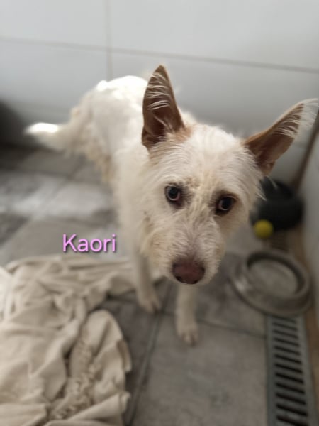 Kaori ist eine bezaubernde Podenca, etwa 6?7 Jahre alt, ca. 57 cm groß, mit weißem, leicht strubbeligem Fell ? ein typischer Podenco Campanero. Ende Oktober 2024 wurde sie in Córdoba nahe der Autobahn beim Gefängnis gefunden, wo sie sich in der Kälte und im Regen um ihre neugeborenen Welpen kümmerte. Sie ließ sie nie allein und versuchte, sie mit ihrem Körper zu schützen. Was mit den anderen Welpen passiert ist, weiß niemand. Vermutlich gehörte Kaori einem Jäger und wurde über Jahre zur Zucht benutzt, bevor man sie einfach aussetzte, als sie nicht mehr gebraucht wurde.