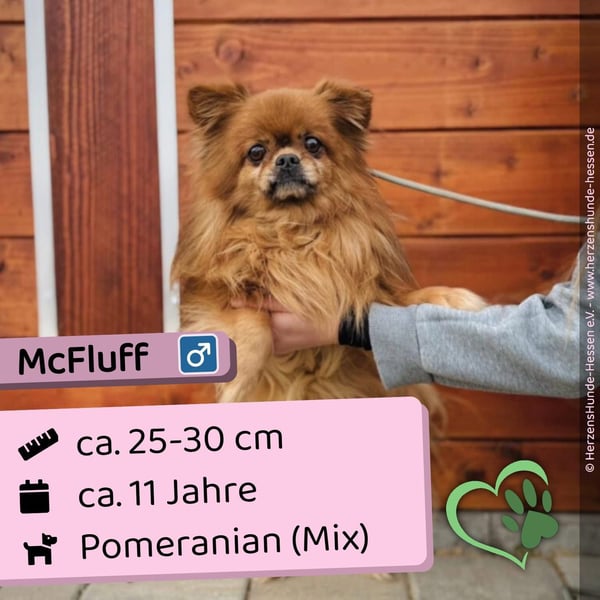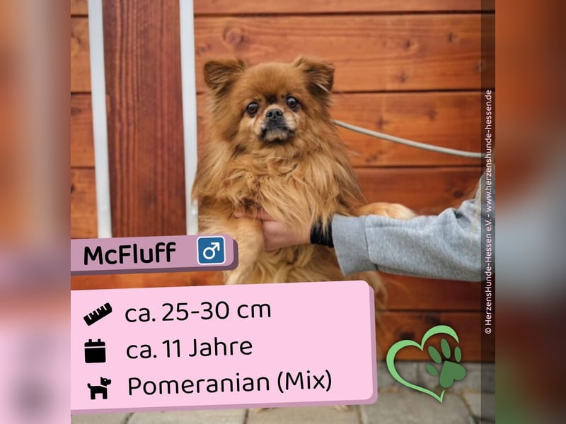 McFluff ist ein zarter, ca. 5 kg leichter Rüde und kam gemeinsam mit seinem Freund Furchill ins Tierheim, nachdem sein Besitzer verstorben ist.