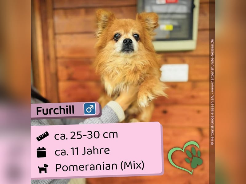 Furchill ist ein zarter, 5 kg leichter Rüde und kam gemeinsam mit seinem Freund McFluff ins Tierheim, nachdem sein Besitzer verstorben ist.